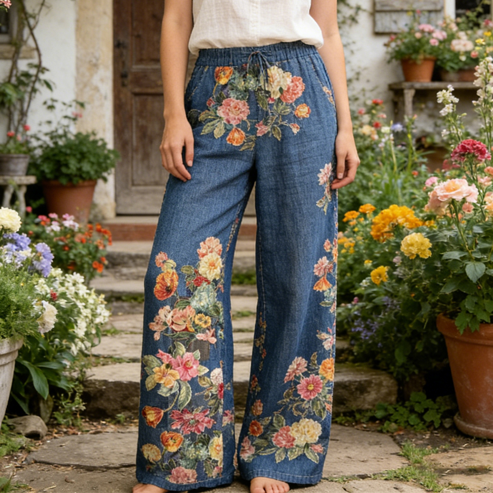 Women's Vintage Rose Floral Pattern Casual Wide Leg Pants
