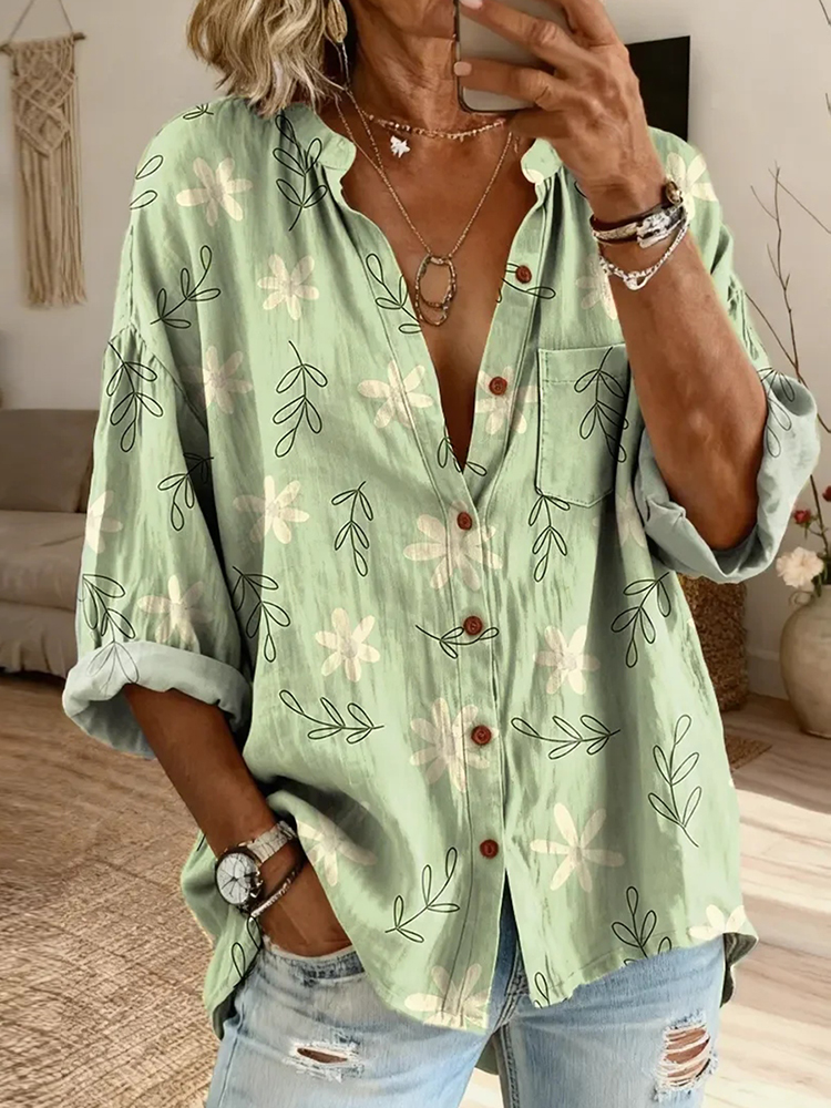 Ethnicity Flowers Light Green Women's Vintage Art Print Casual Cotton And Linen Shirt