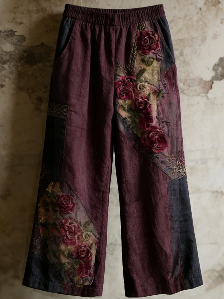 Women's Faded Rose Woven Embroidery Purple Patchwork Cotton Linen Casual Pants