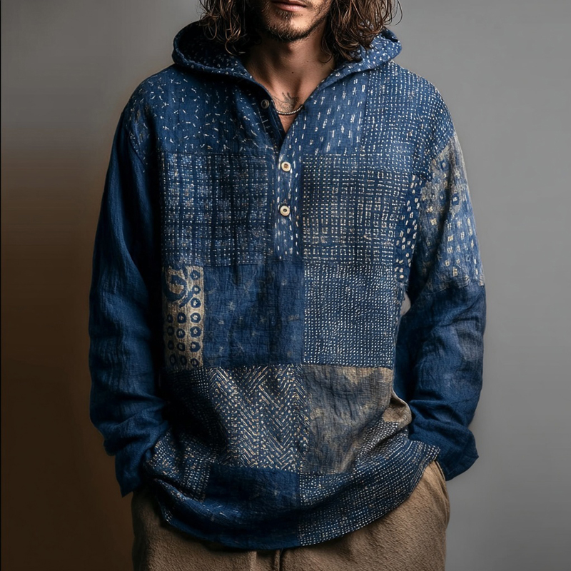 Men's Vintage Patchwork Pattern Hooded Linen Shirt