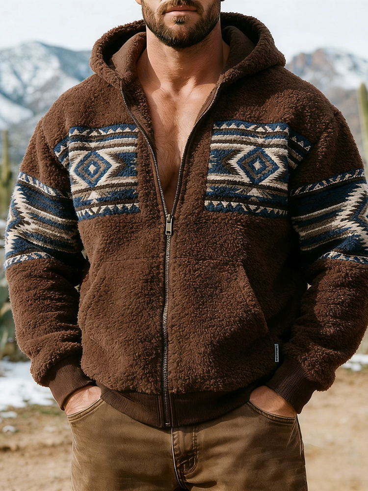 Men's Vintage Geometric Plush Warm Zip-up Hooded Sweatshirt