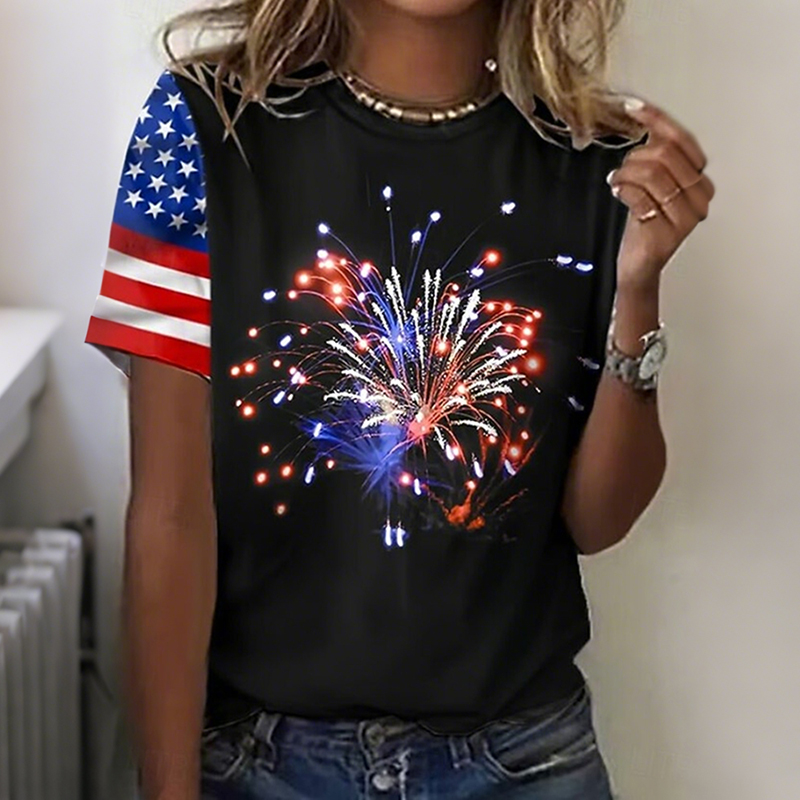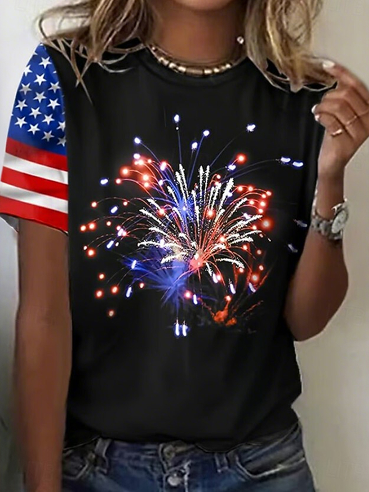 Women's Casual American 250th Anniversary With Fireworks Print Round Neck T Shirt