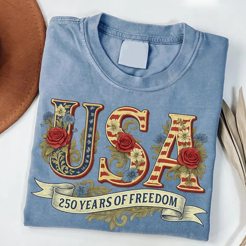 Women's American 250th Anniversary Floral Art Round Neck T Shirt