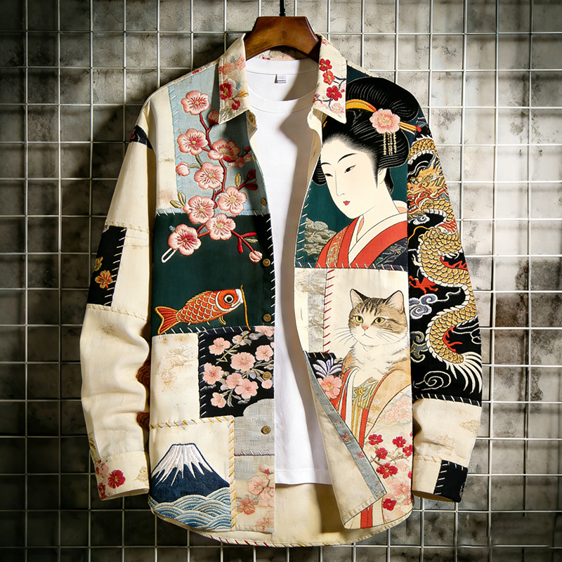 Men's Japanese Art Dragon Ukiyo-e Bijin-ga Patchwork Print Long Sleeve Shirt