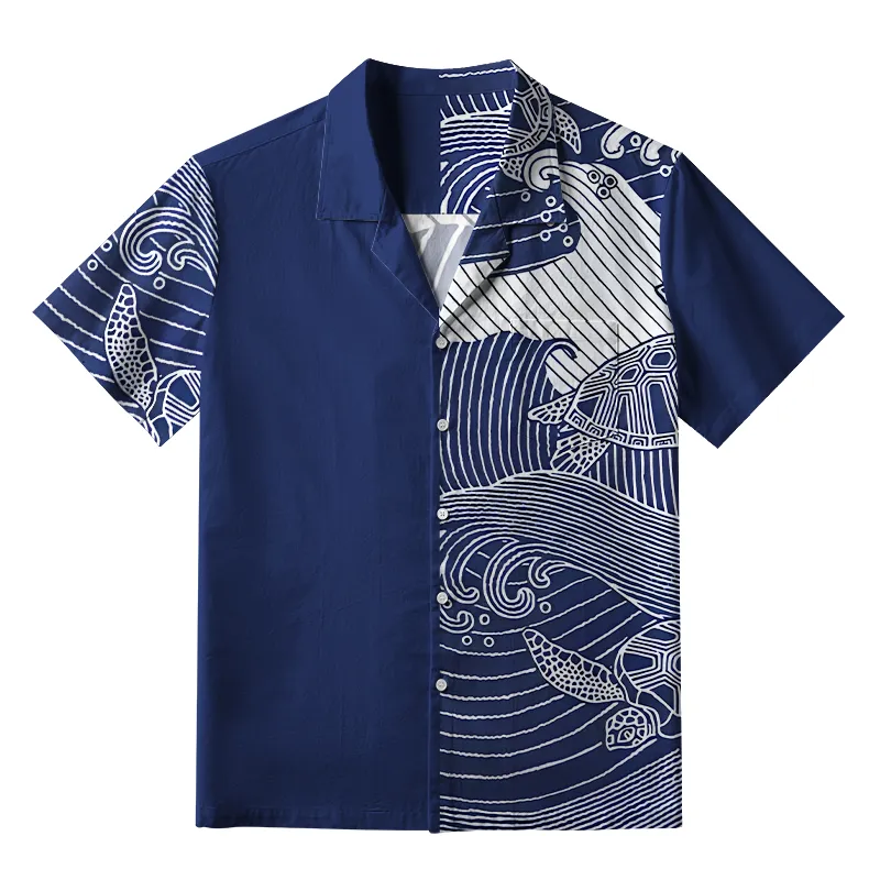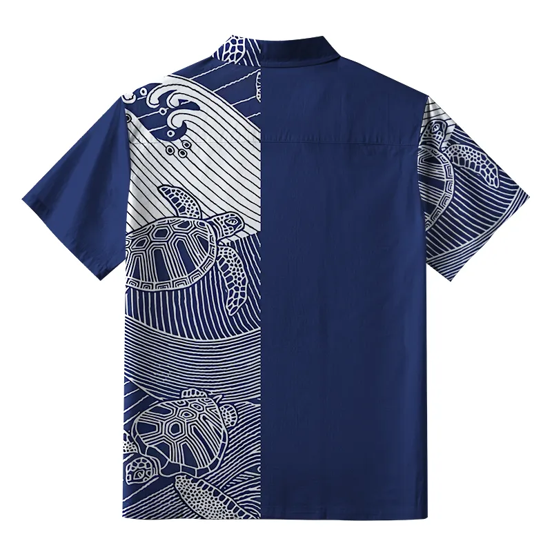 Men's Japanese-style Art Fish Print Color-blocked Short-sleeved Shirt