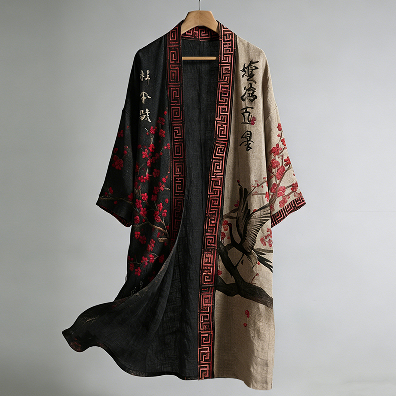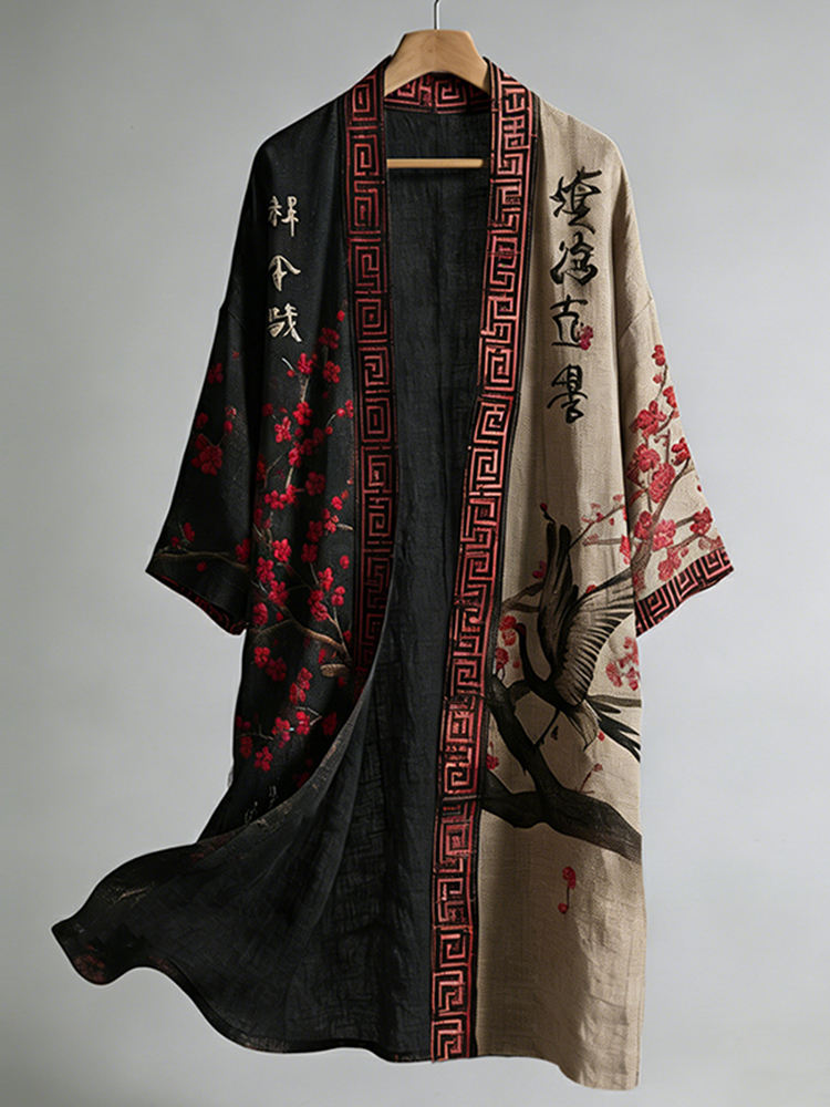 Retro Japanese Crane And Calligraphy/painting Pattern Linen Blend Kimono