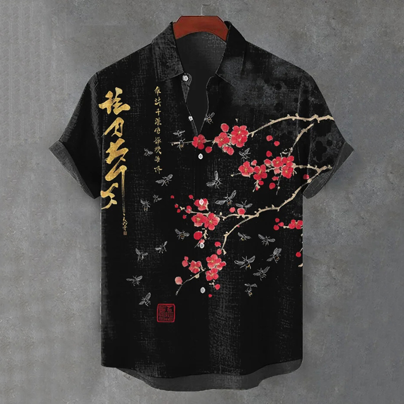 Men's Vintage Bees And Red Plum Blossom Pattern Casual Shirt