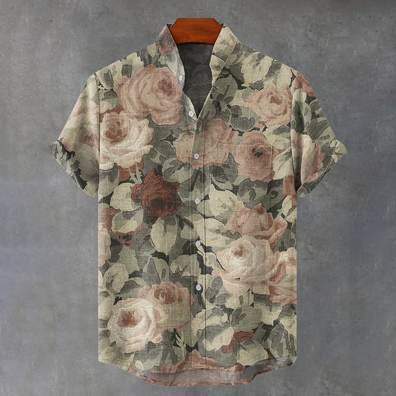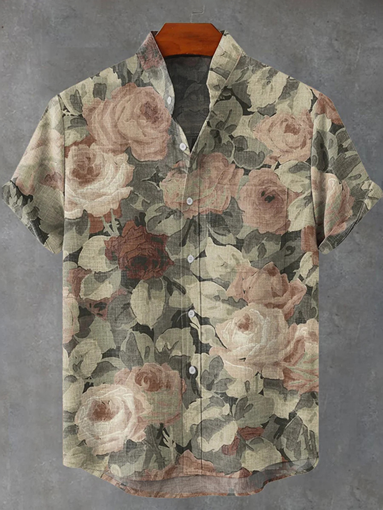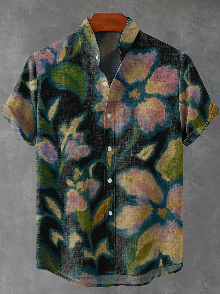 Men's Retro Floral Print Casual Short-sleeve Linen Shirt