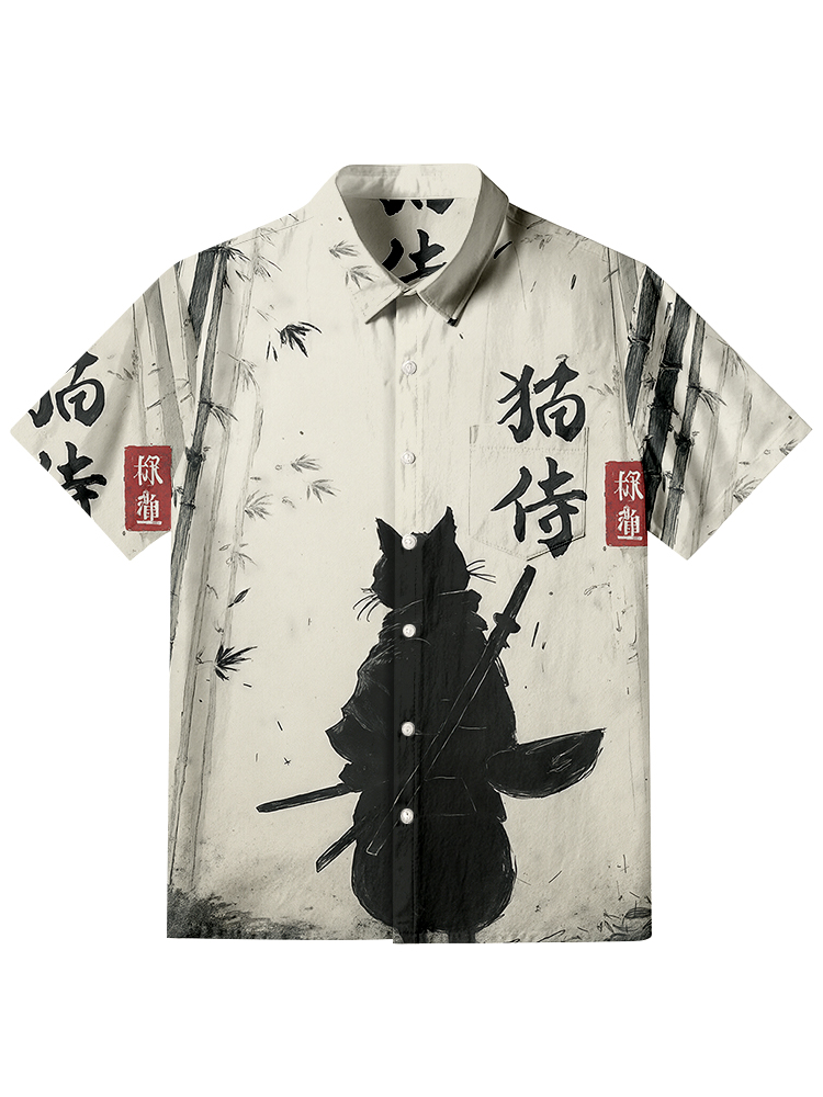 Men's Black Cat Samurai Swordsman Print Short Sleeve Shirt