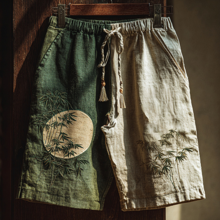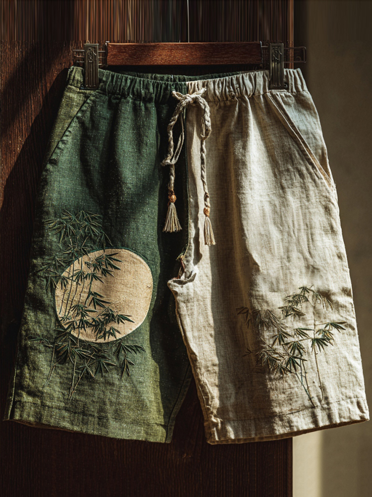Men's Japanese Bamboo Calligraphy Art Contrast Linen Pants