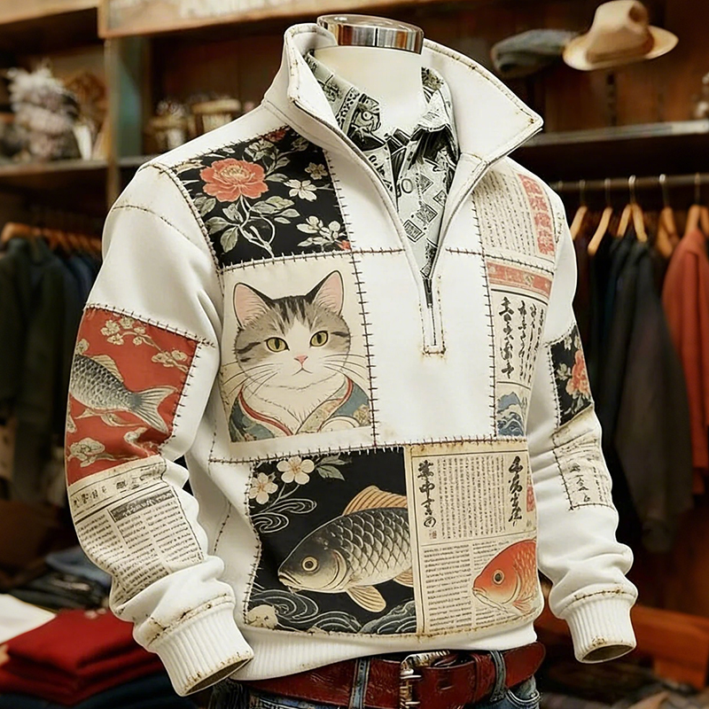Men's Japanese Cat Print Zip-up Sweatshirt