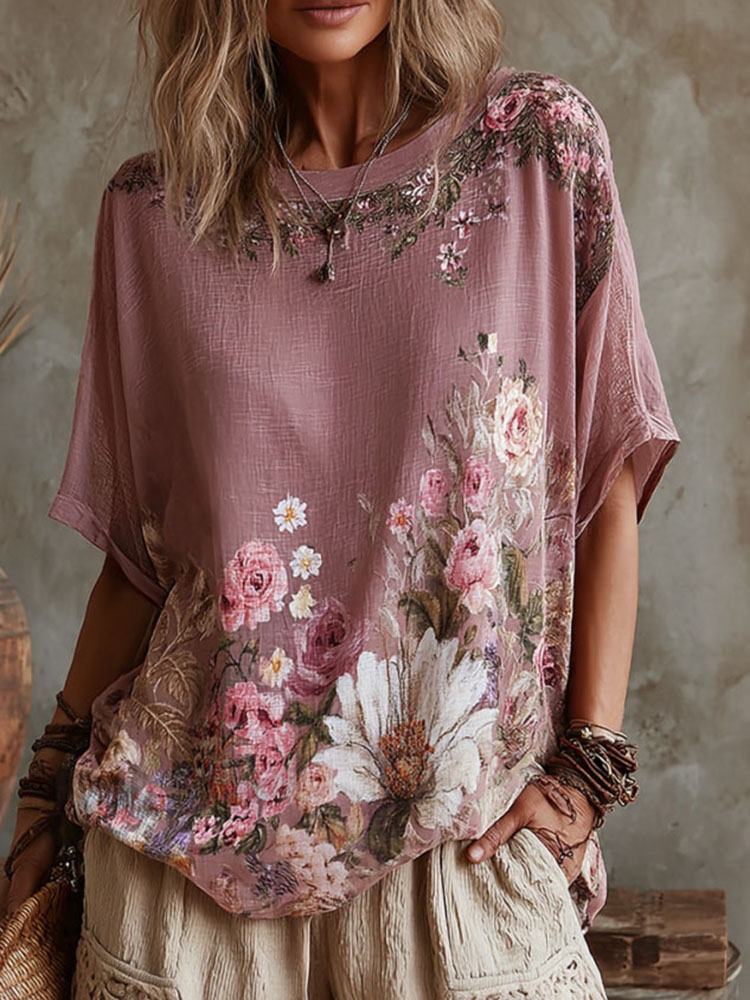 Women's Casual Round-neck Floral Printed Cotton-linen Top