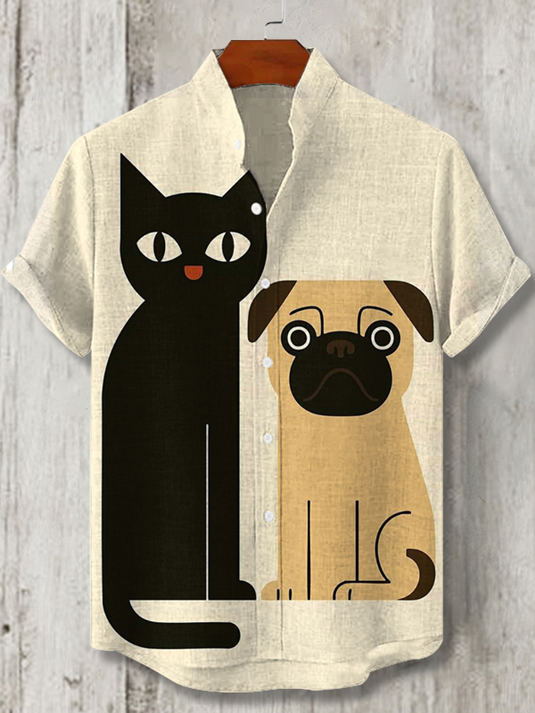 Vintage Black Cat And Pug Abstract Art Print Casual Cotton Shirt