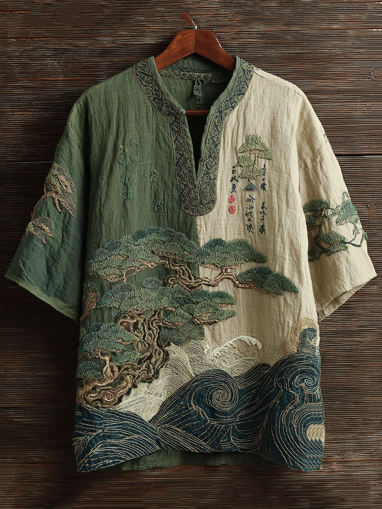 Men's Vintage Japanese Landscape Embroidery Casual V Neck Shirt