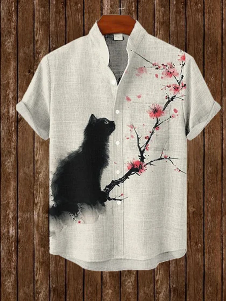 Japanese Cherry Blossom & Cat Print Men's Short Sleeve Shirt