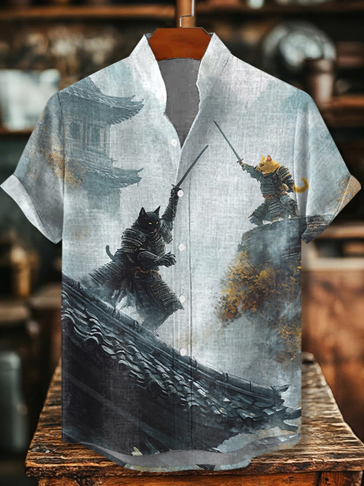 Men's Kimono Cat Long Sword Art Print Short Sleeve Shirt