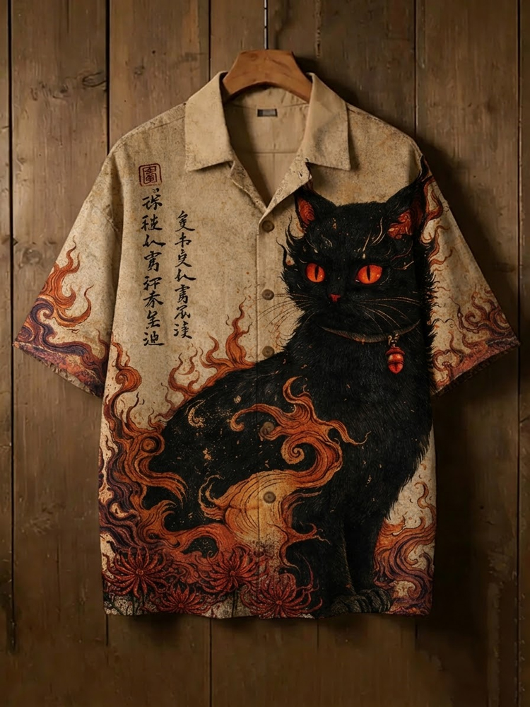 Men's Vintage Japanese Samurai Cat Print Casual Shirt