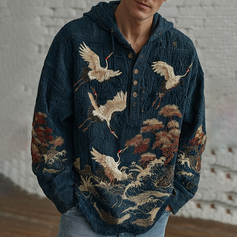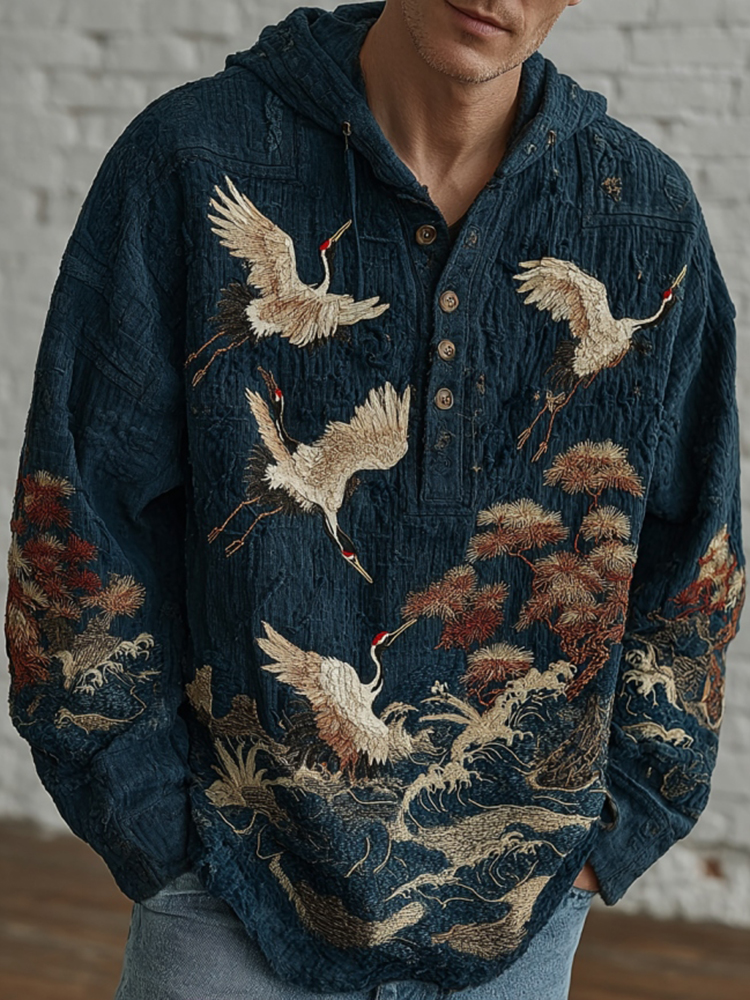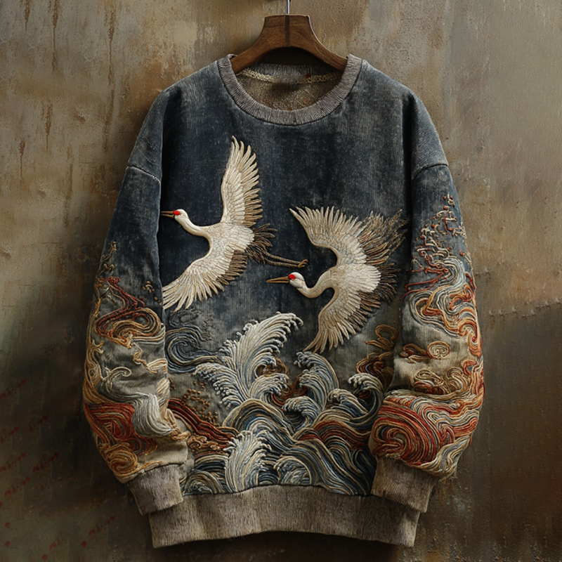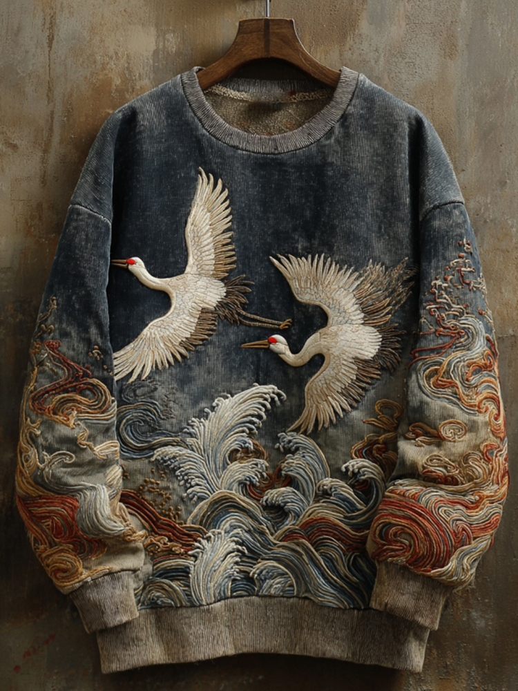 Men's Japanese Crane Embroidery Art Casual Sweatshirt