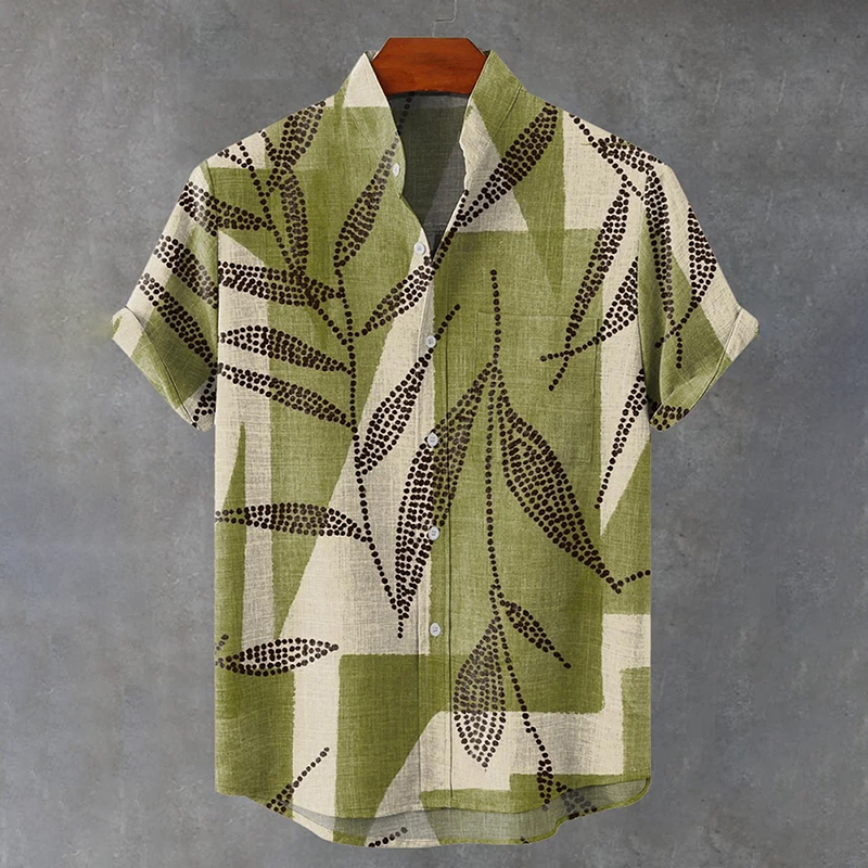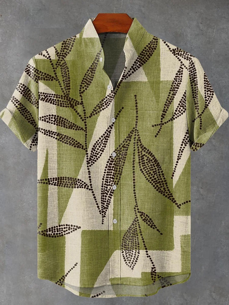 Men's Botanical Geometric Art Print Short Sleeve Linen Blend Shirt