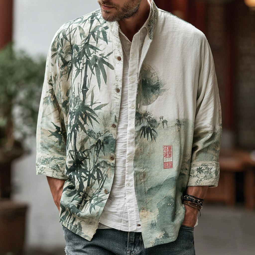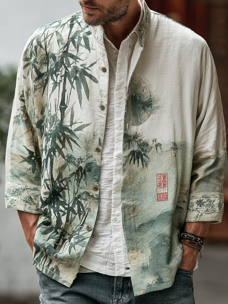 Men's Vintage Japanese Bamboo Forest Art Linen Blend Shirt