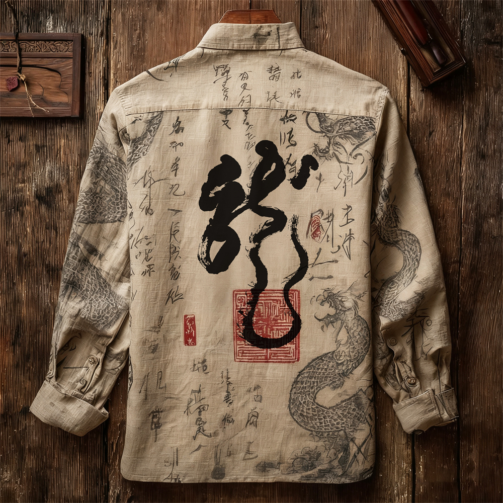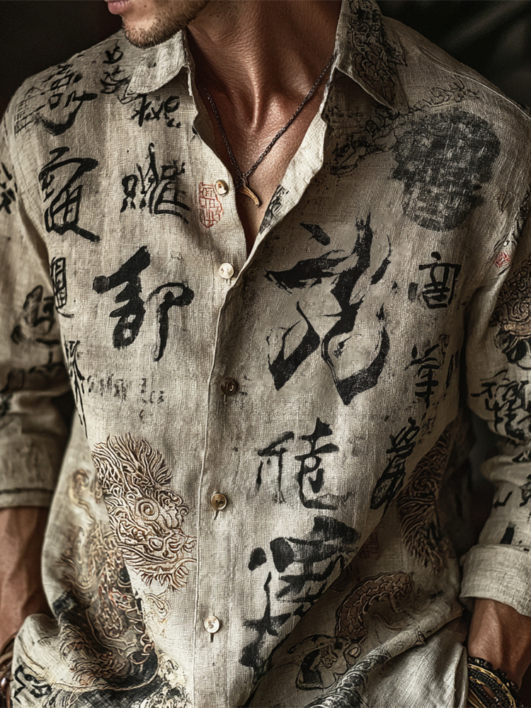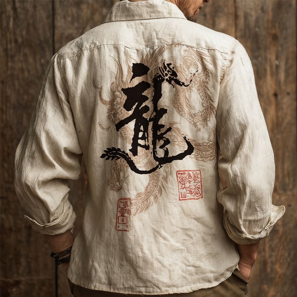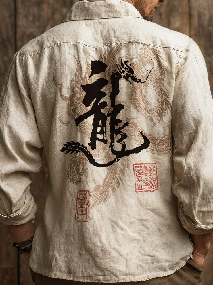 Japanese Zen-inspired Dragon Calligraphy Vintage Men's Linen Long-sleeve Shirt