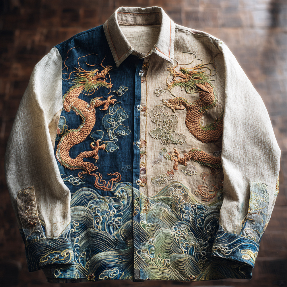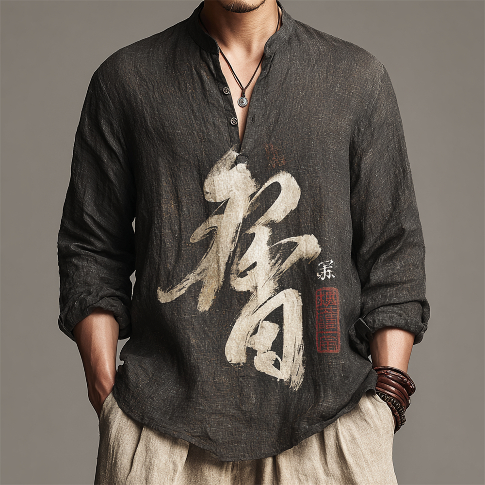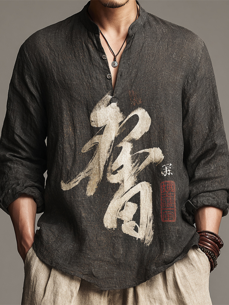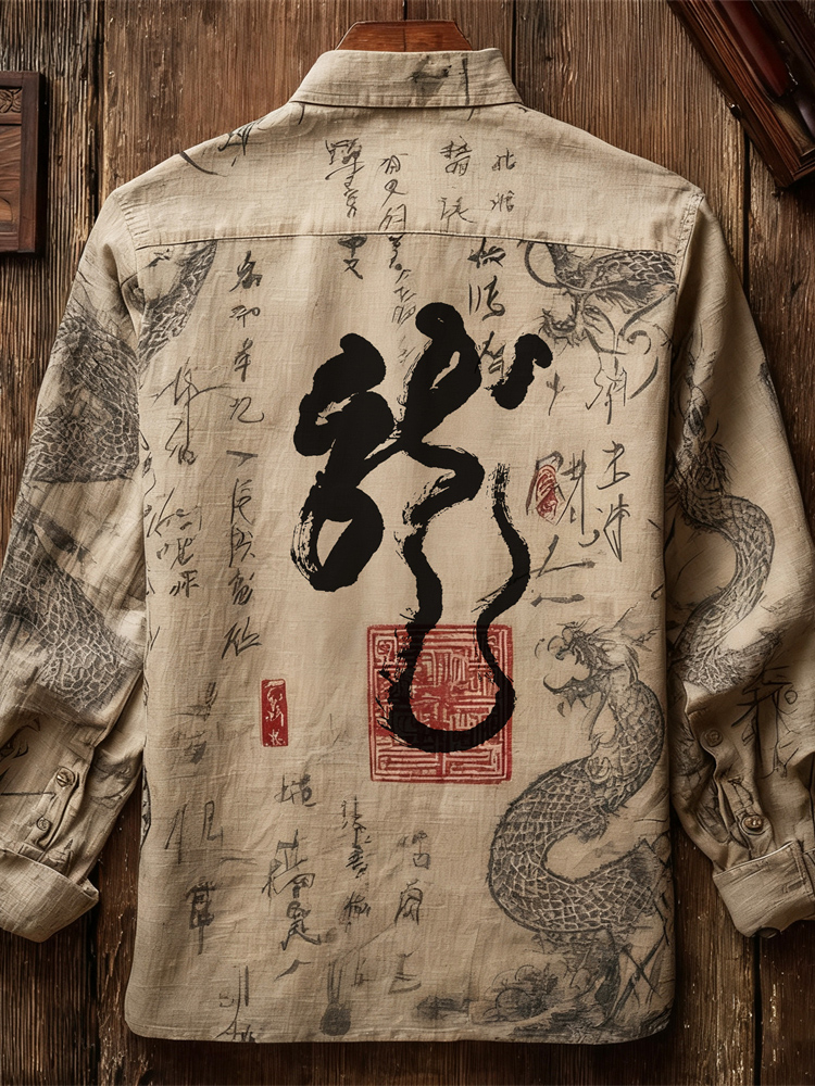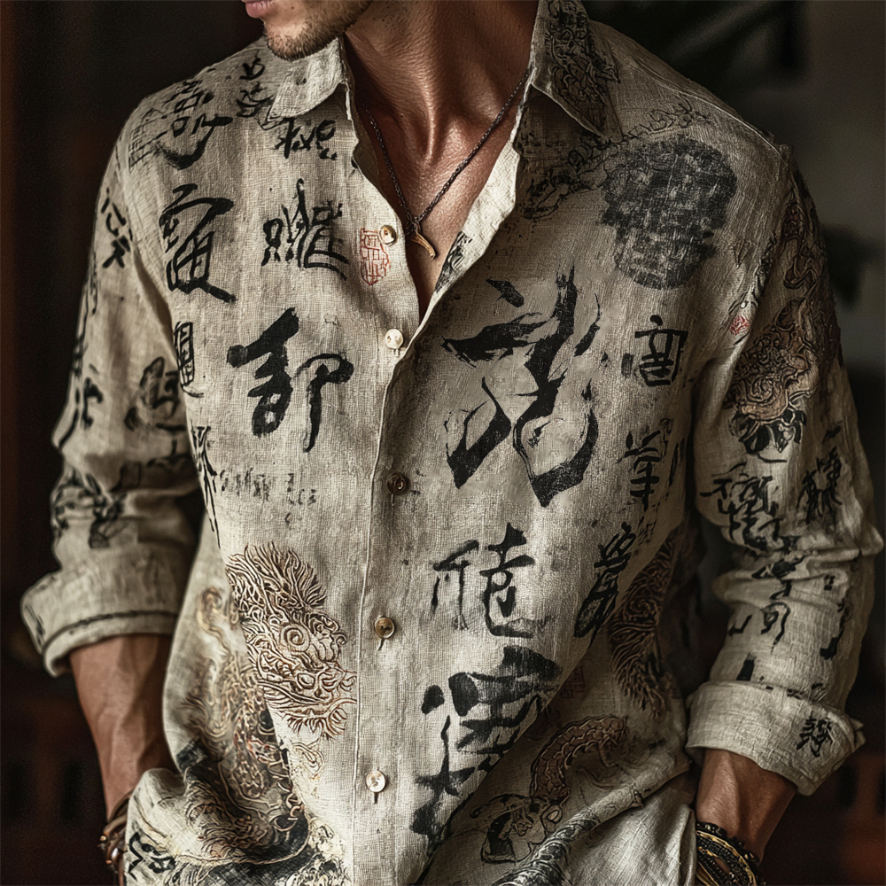 Japanese Zen-inspired Dragon Calligraphy Vintage Men's Linen Long-sleeve Shirt