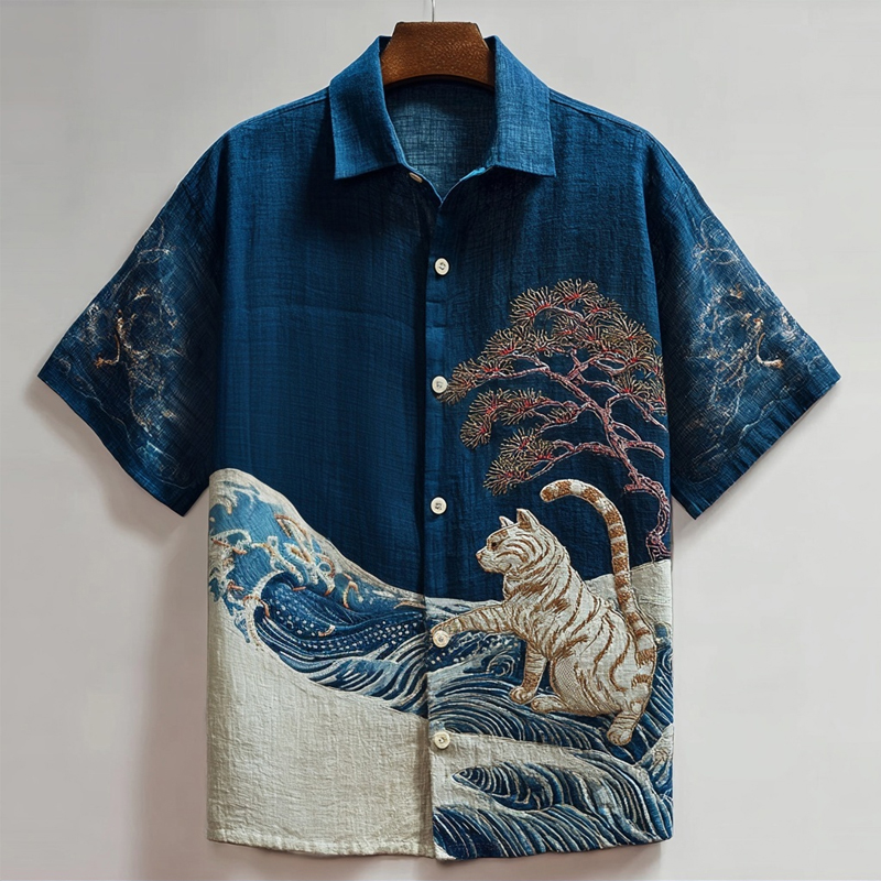 Vintage Japanese Waves & Cat Embroidery Art Linen Shirt