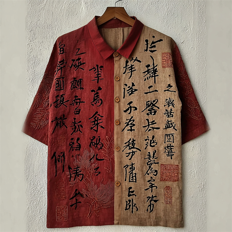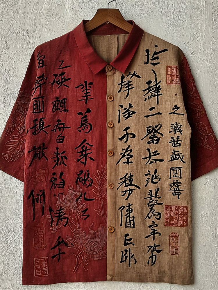 Japanese Ancient Calligraphy Art Contrast Color Linen Shirt