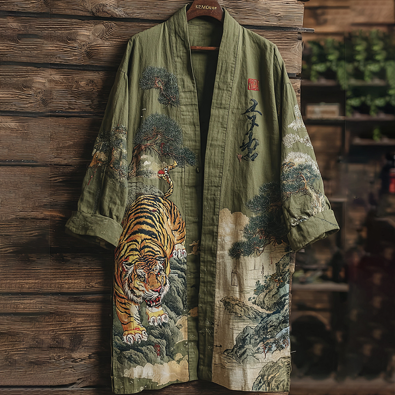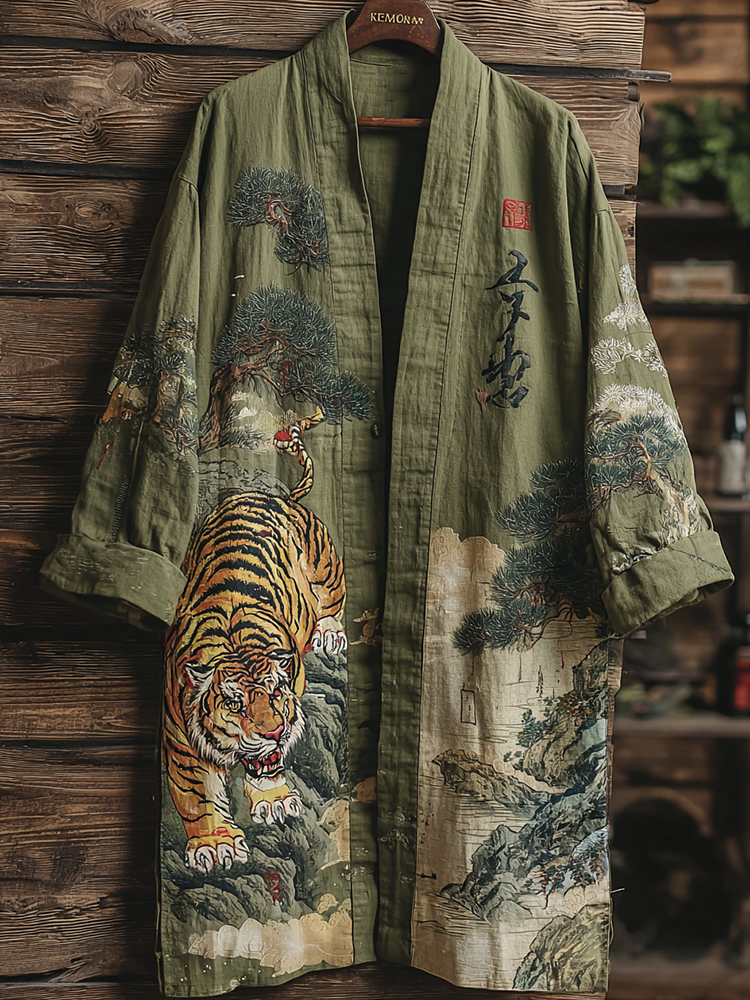 Men's Japanese Tiger And Floral Art Print Casual Cardigan