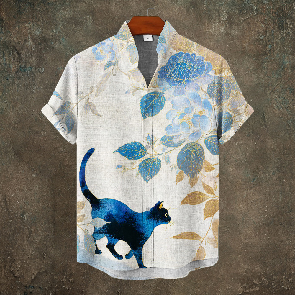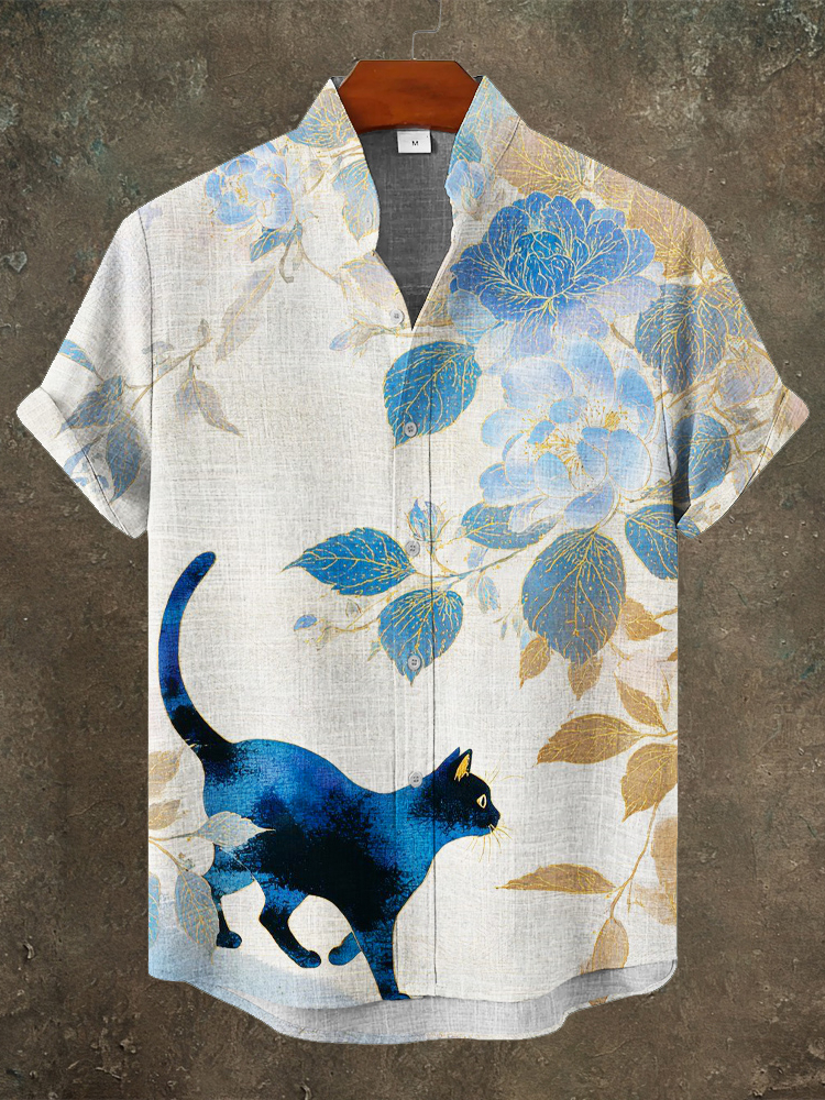 Vintage Cat Embroidery Art Men's Linen Short Sleeve Shirt