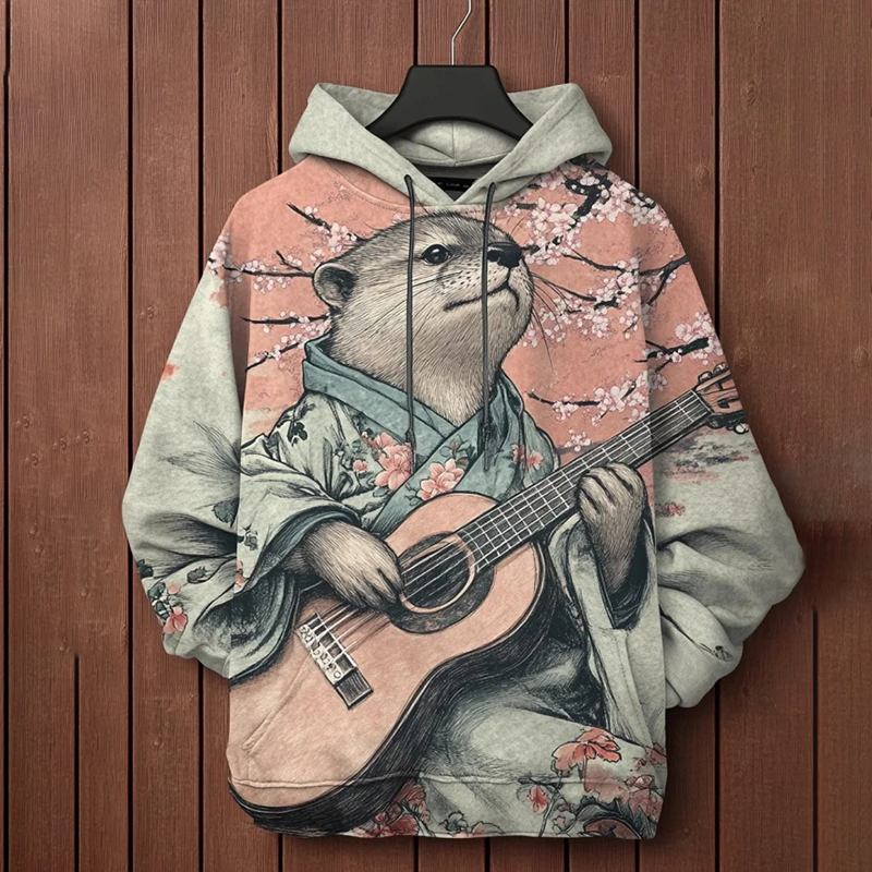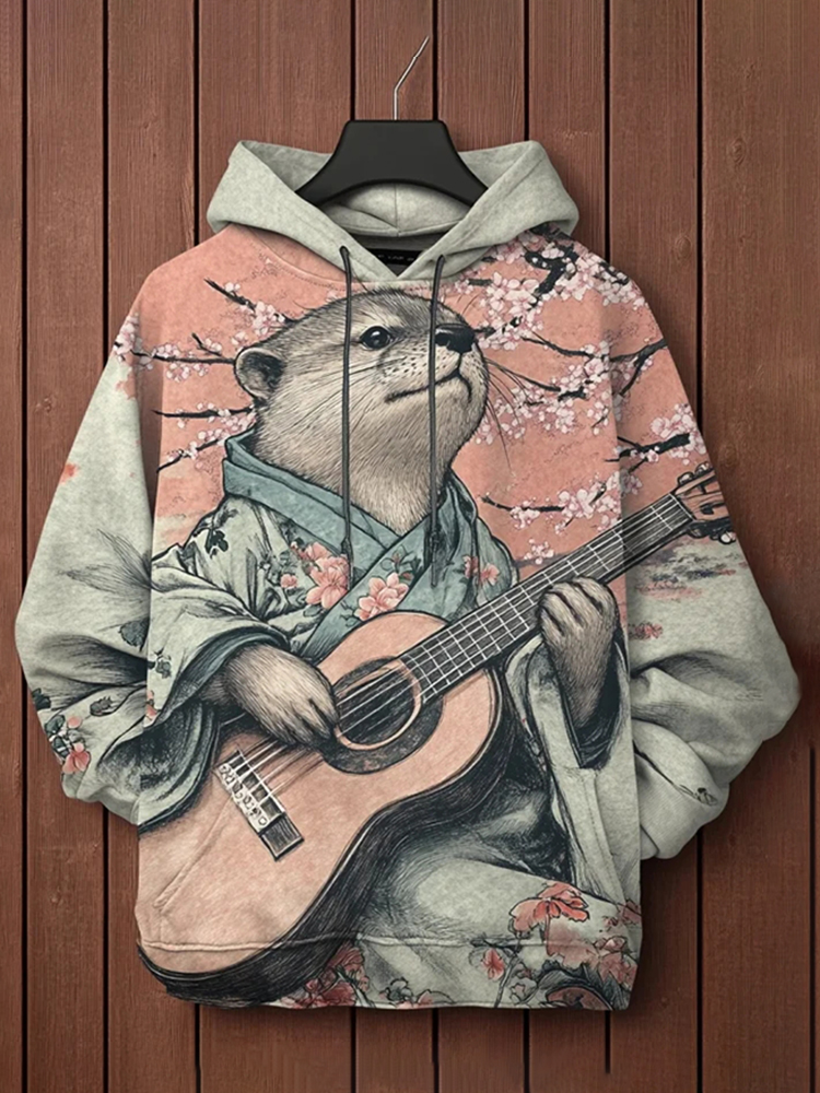 Men's Kimono Otter Playing Guitar Under Cherry Blossom Tree Print Hooded