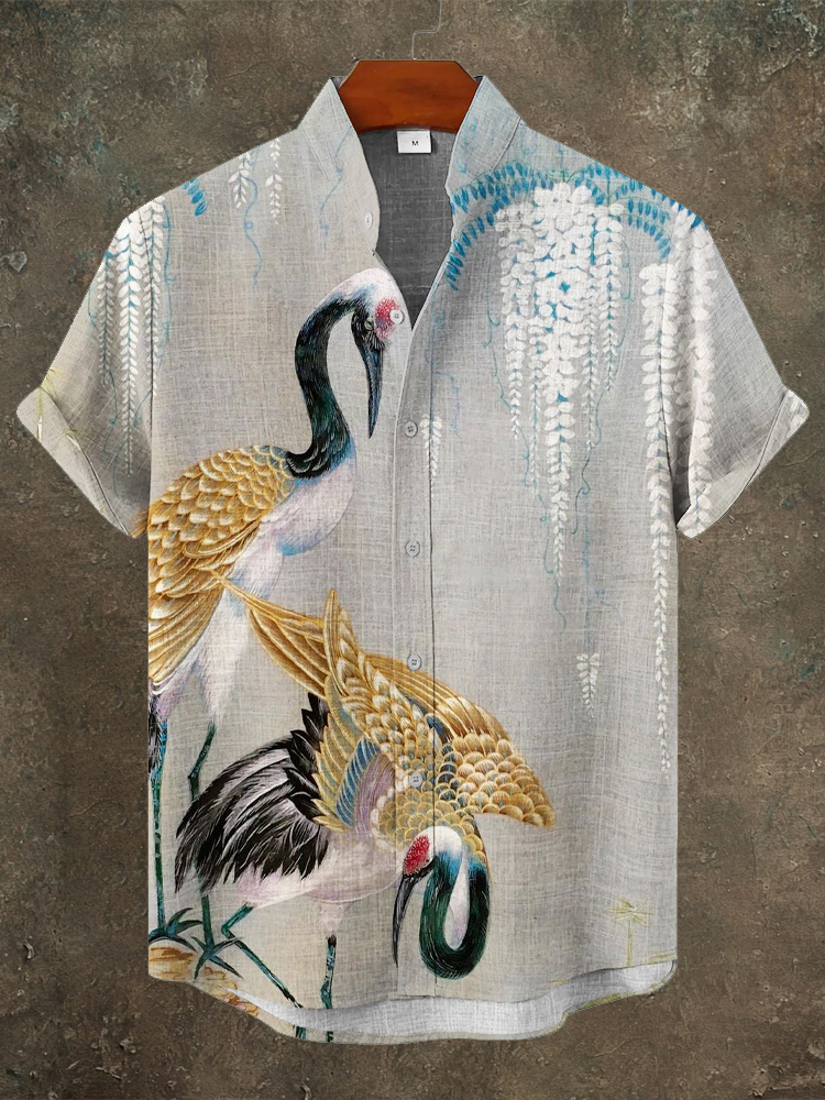 Japanese Crane Print Men's Linen Short Sleeve Shirt