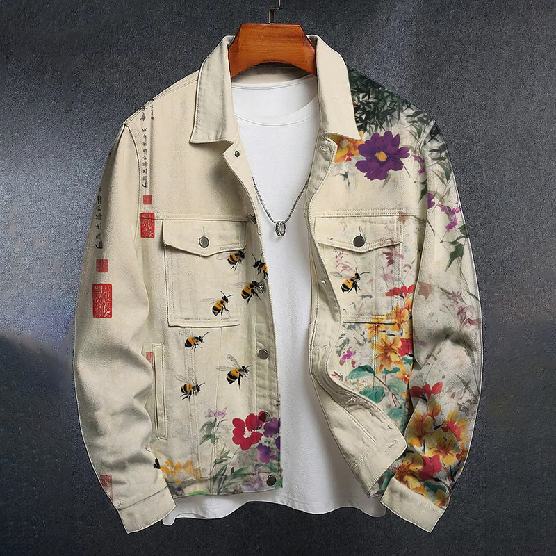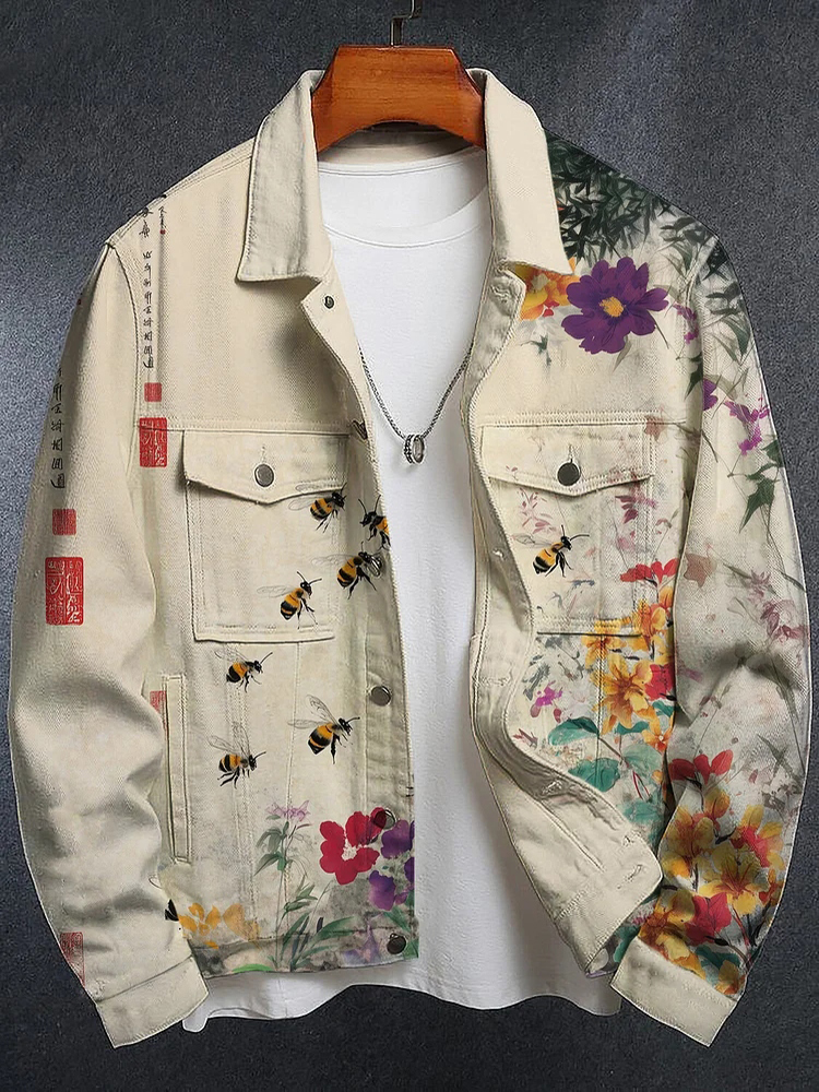 Men's Men's Colorful Garden Bee Chinese Ink Painting Print Long Sleeve Denim Jacket