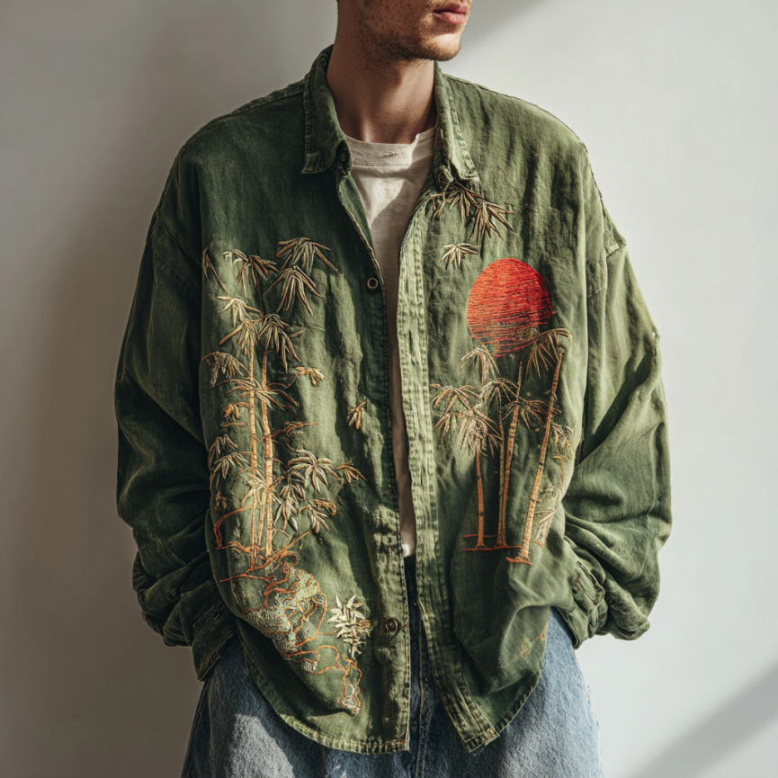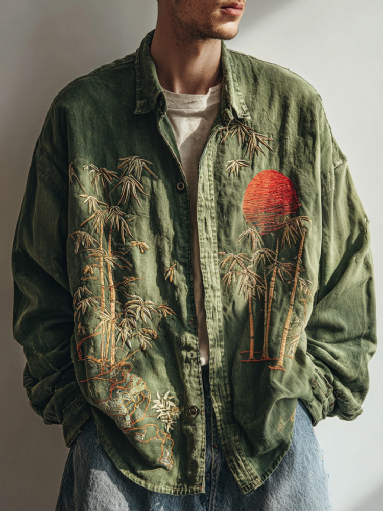 Men's Vintage Bamboo Forest And Red Sun Embroidery Art Linen Shirt