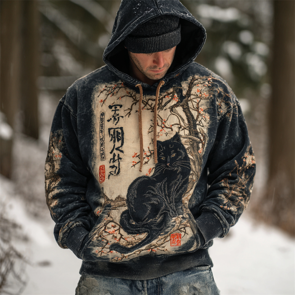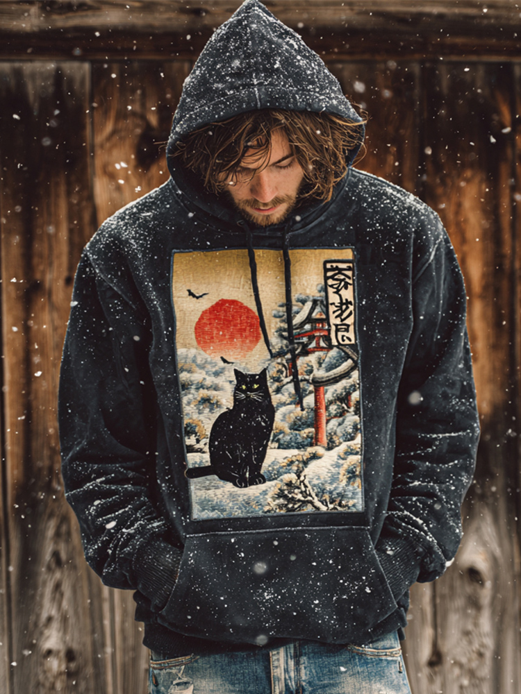 Japanese Black Cat Snow Figure Men's Hooded Sweatshirt