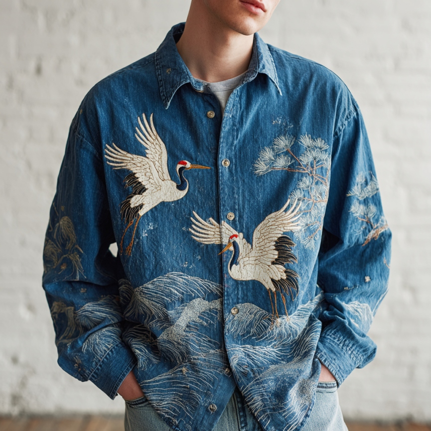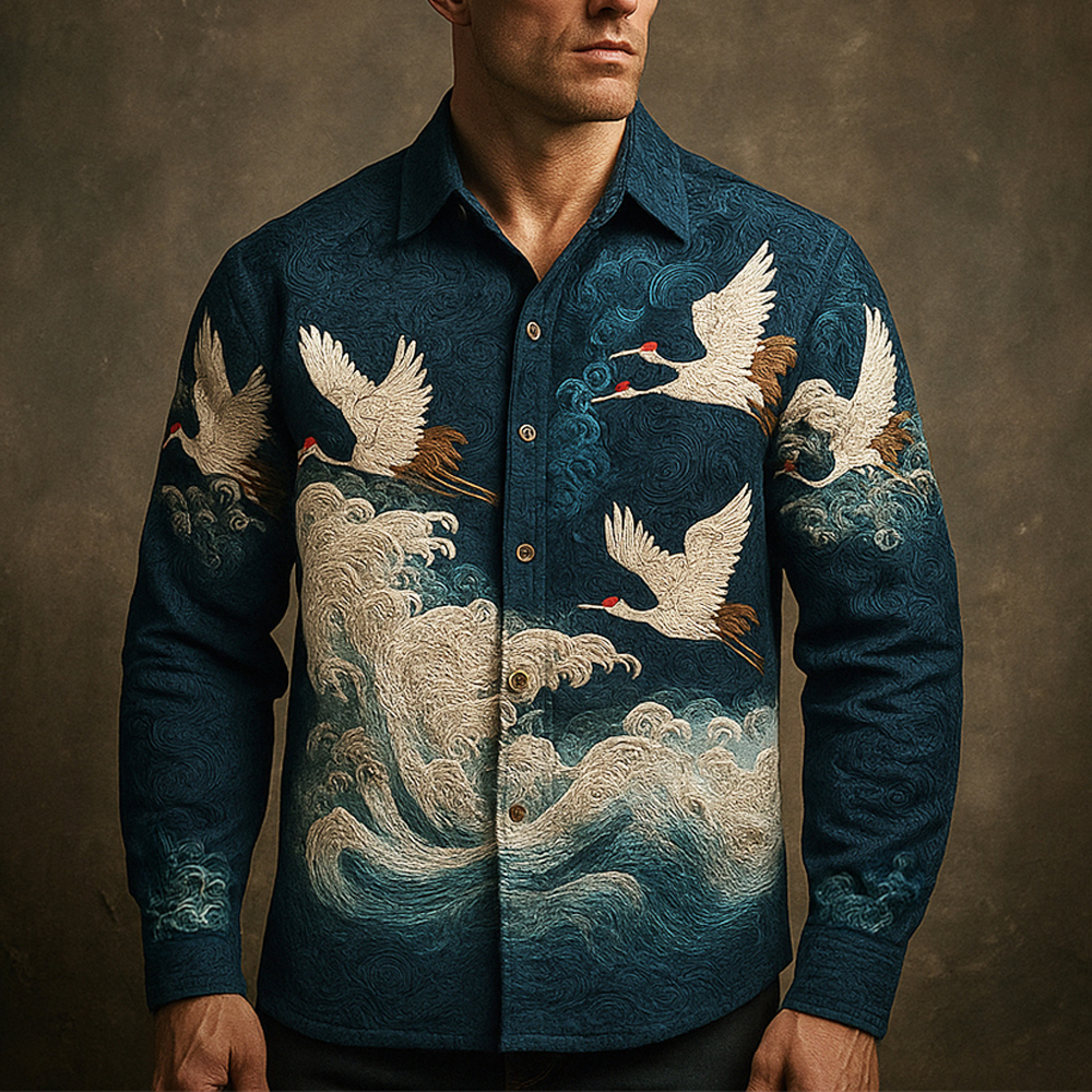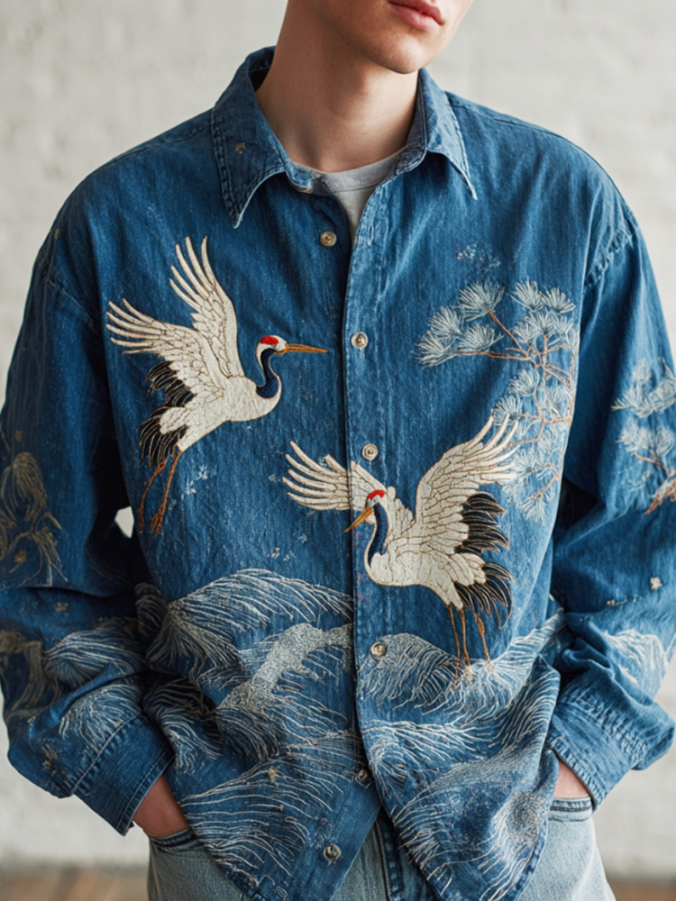 Men's Vintage Japanese Wave & Crane Embroidery Art Linen Shirt