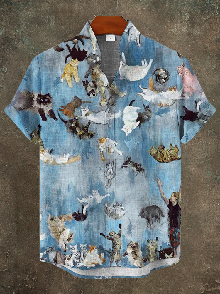Vintage Oil Painting Cat Art Men's Linen Short Sleeve Shirt