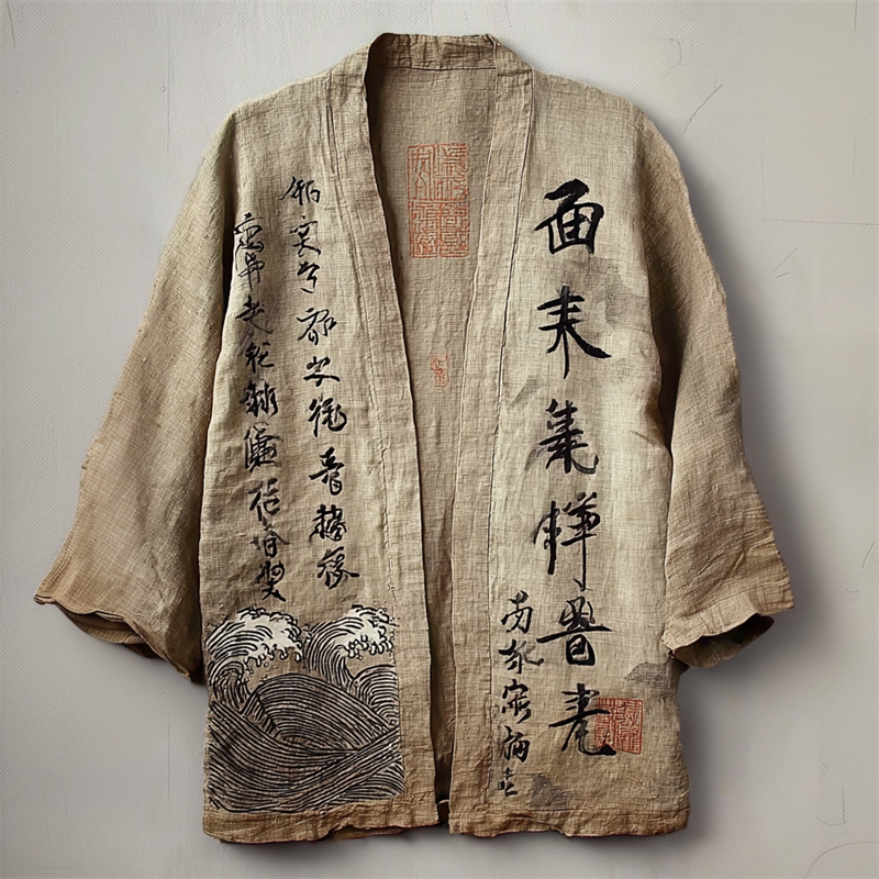 Japanese Sea Waves Calligraphy Art Linen Kimono Cardigan