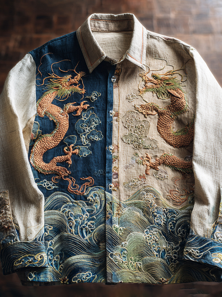 Japanese Dragon Embroidery Art Men's Linen Long Sleeve Shirt