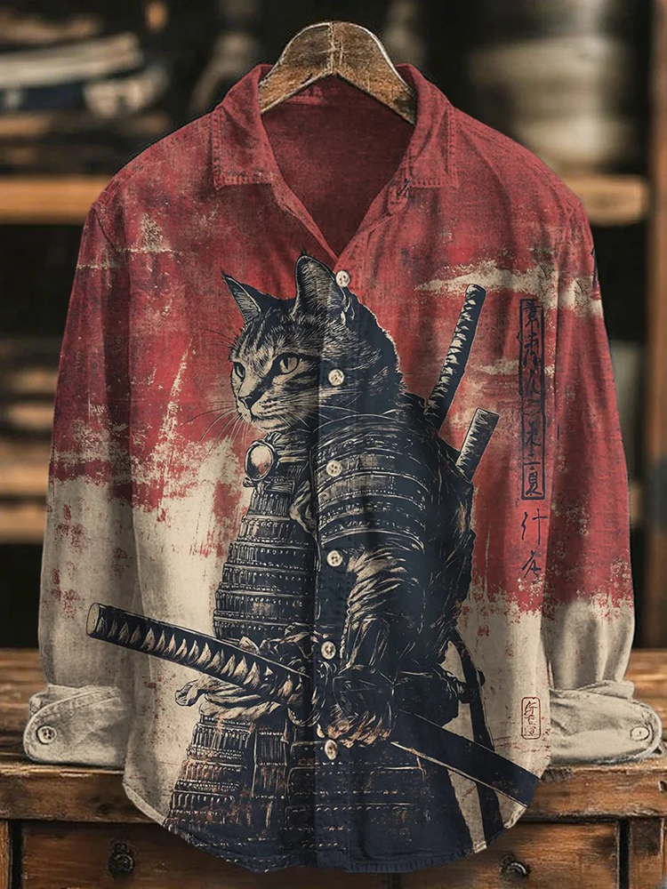 Men's Cat Samurai Japanese Katana Print Long Sleeve Shirt