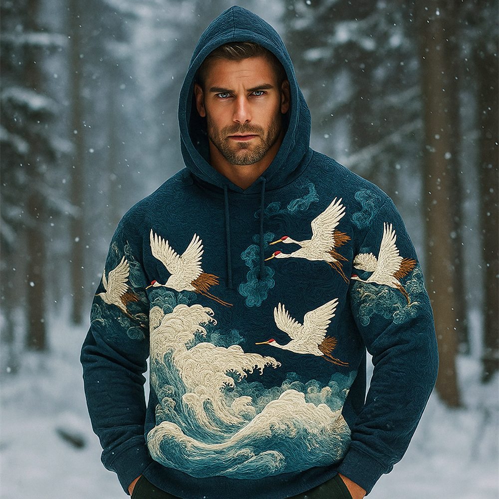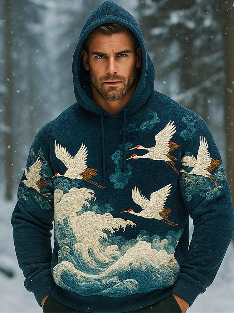 Japanese Wave & Crane Art Men's Hooded Sweatshirt