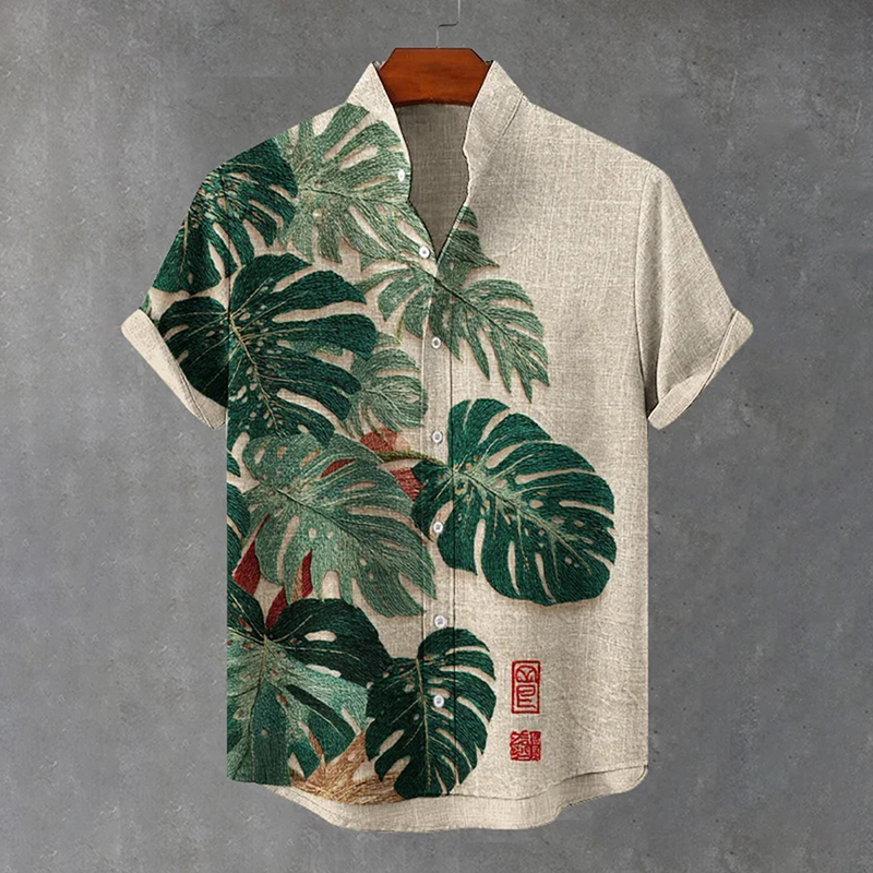 Men's Botanical Art Print Short Sleeve Linen Blend Shirt
