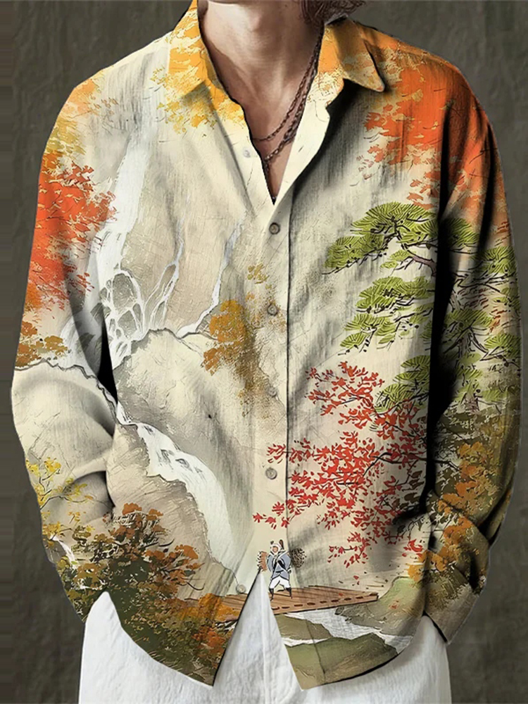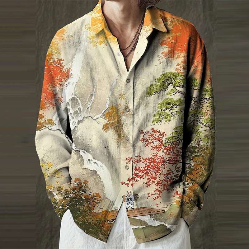 Men's Mountain Stream Landscape Chinese Style Art Print Long Sleeve Shirt