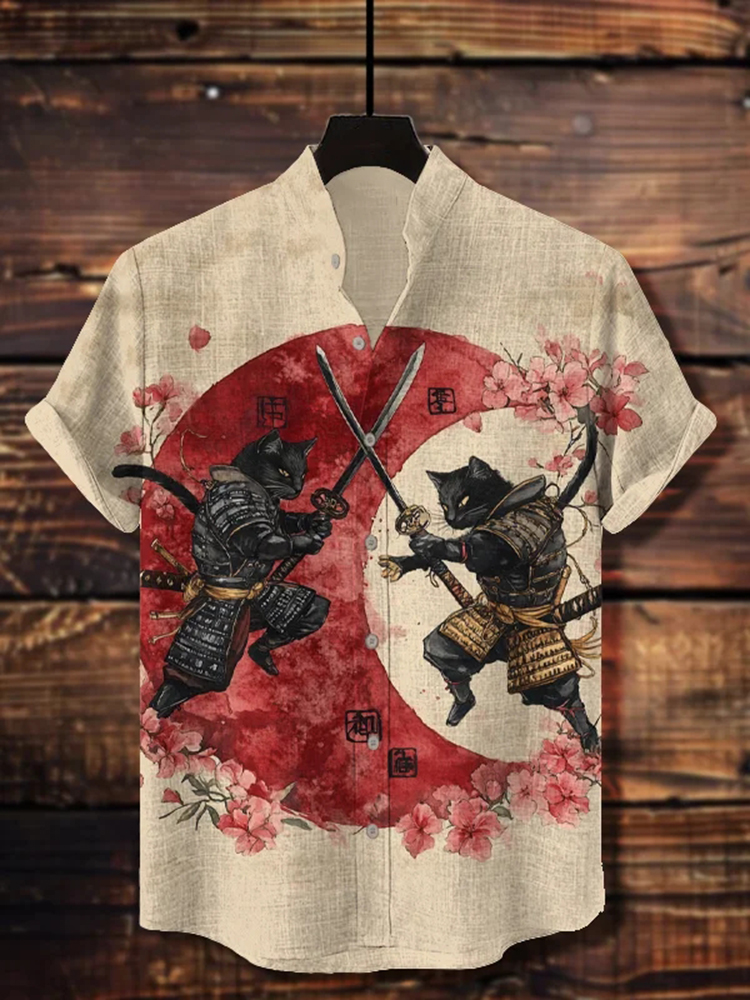Men's Japanese Samurai Cat Print Short Sleeve Shirt