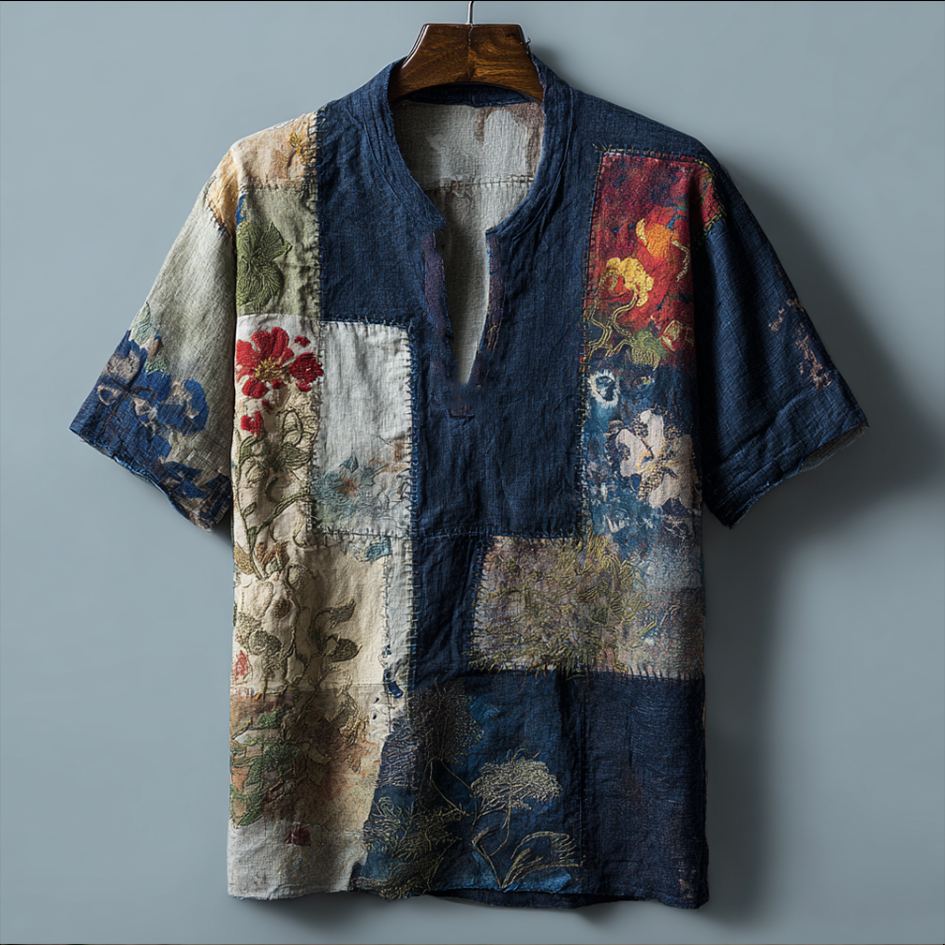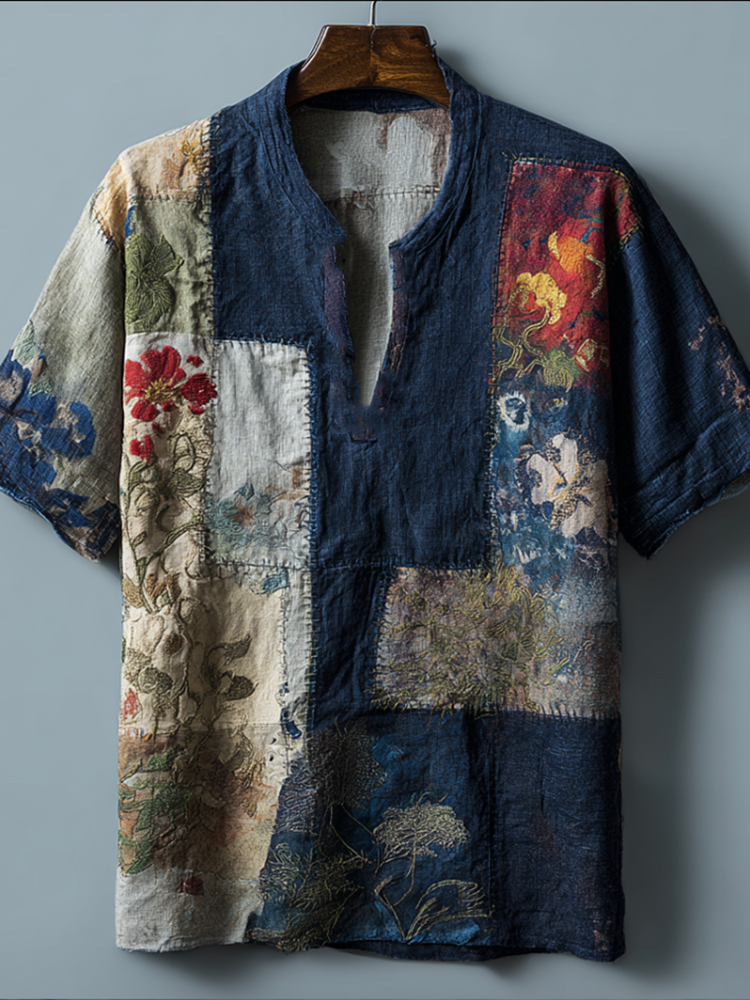 Men's Vintage Patchwork Pattern Hooded Linen Shirt