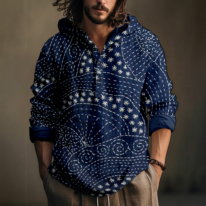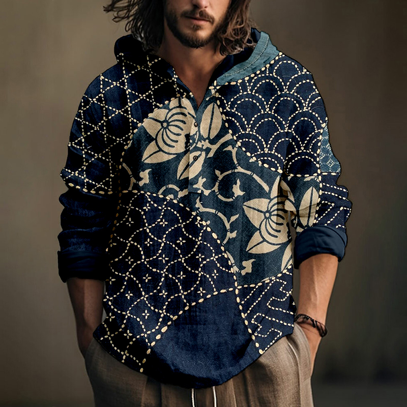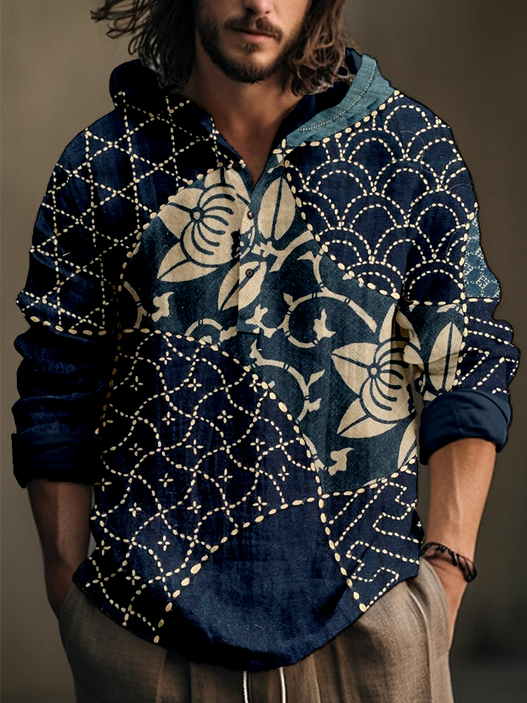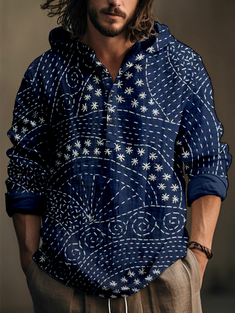Men's Japanese Sashiko Art Vintage Hooded Linen Shirt