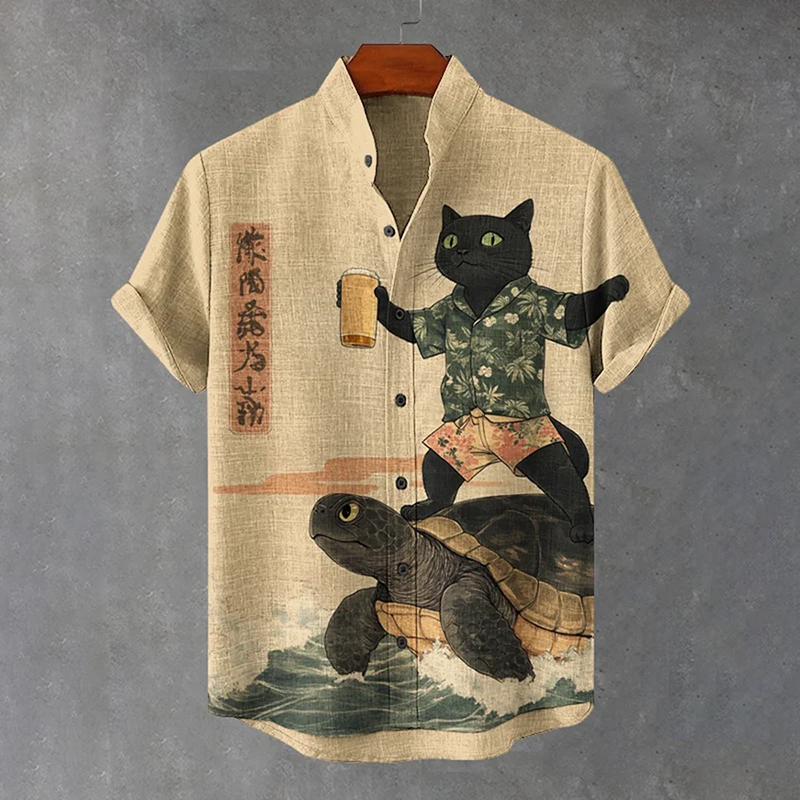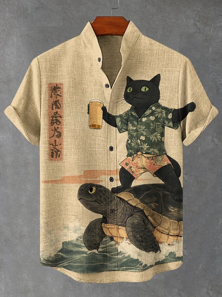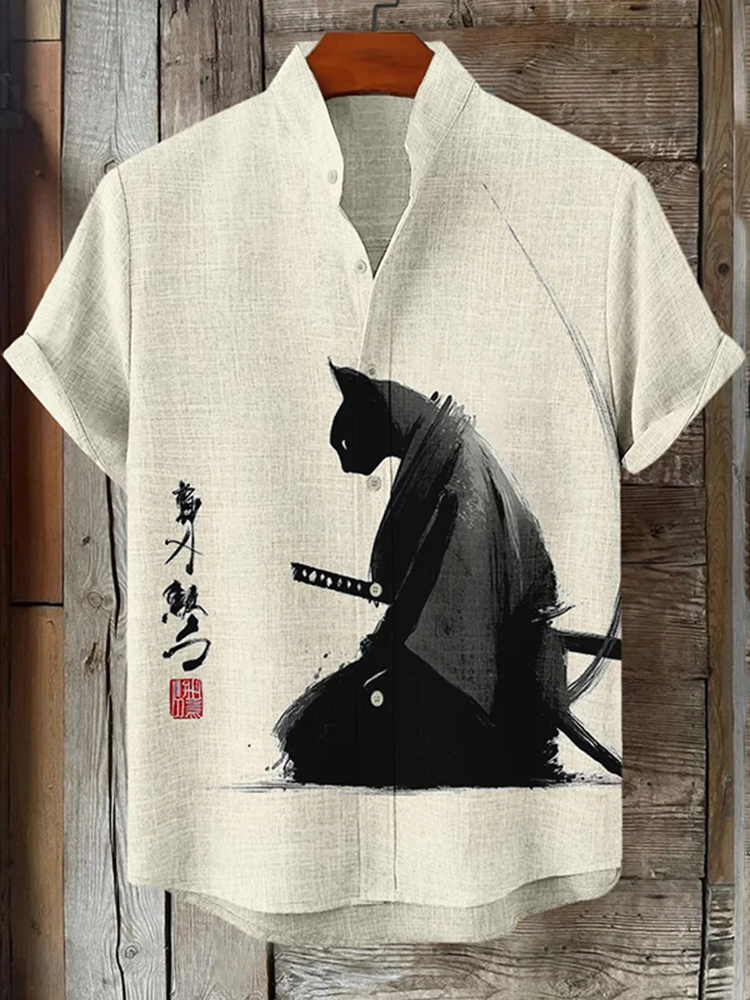 Vintage Japanese Cat Print Men's Linen Short Sleeve Shirt