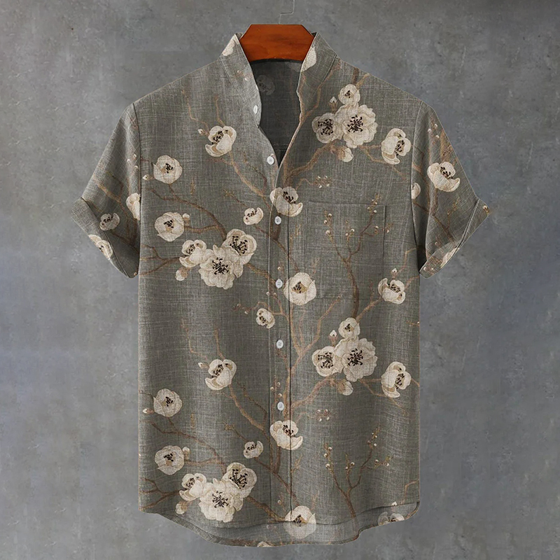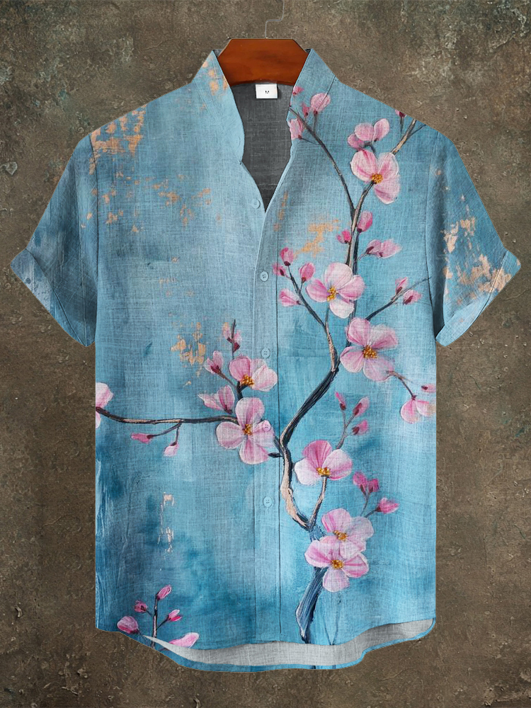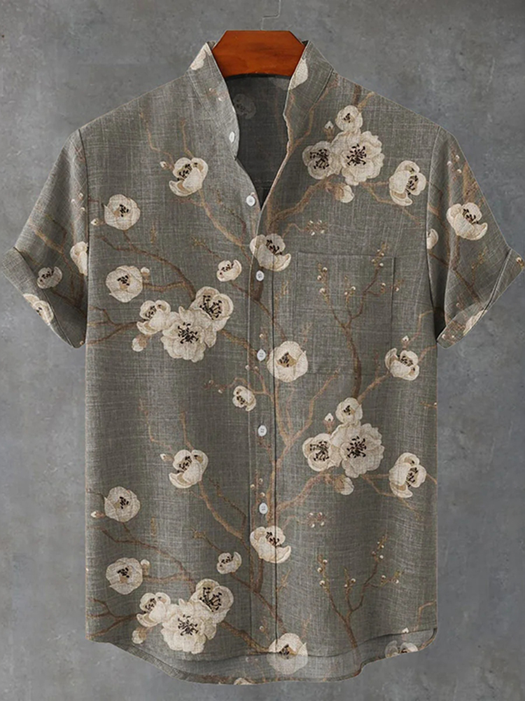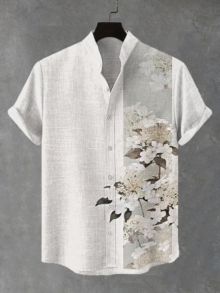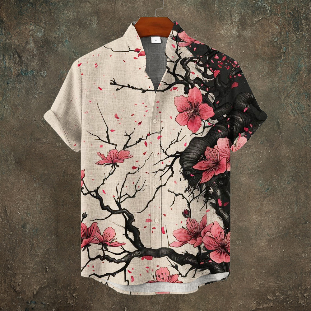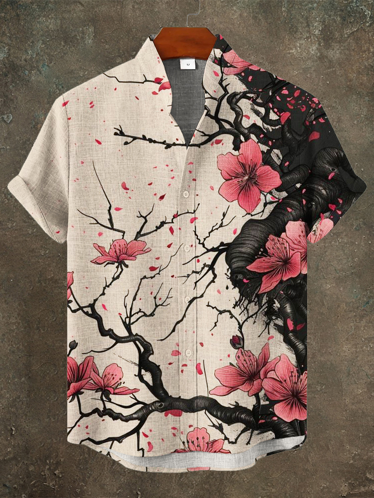 Japanese Art Flower Men's Linen Short Sleeve Shirt