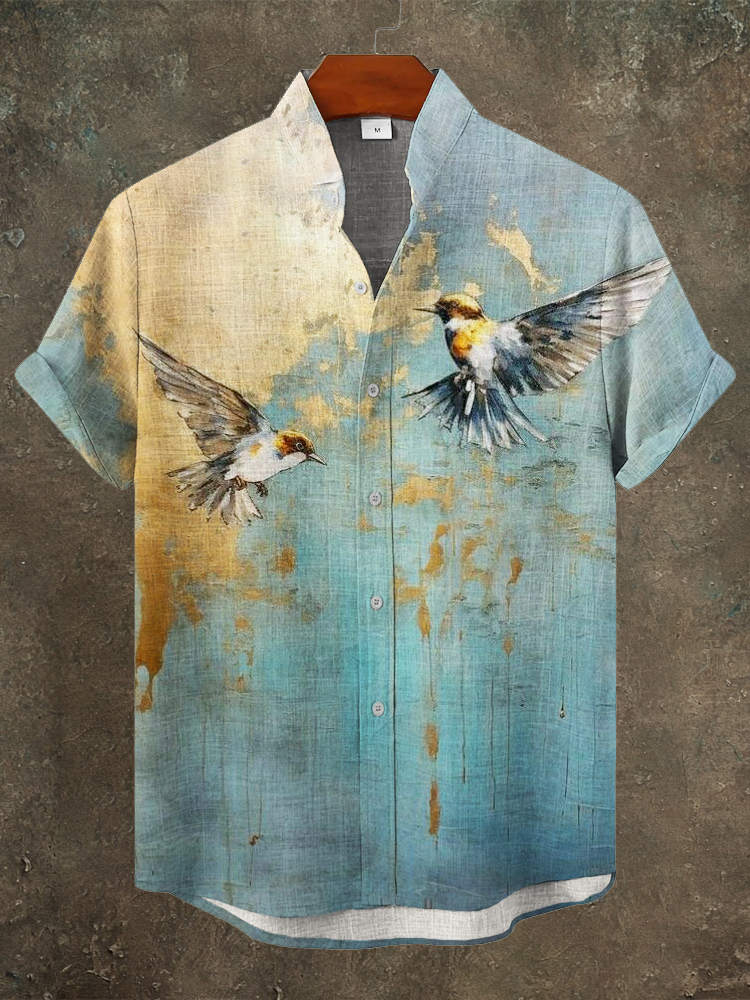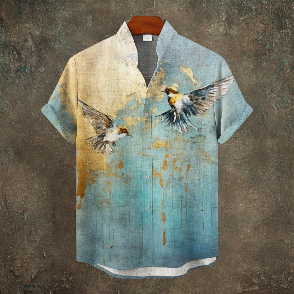 Japanese Oil Painting Bird Men's Linen Short Sleeve Shirt
