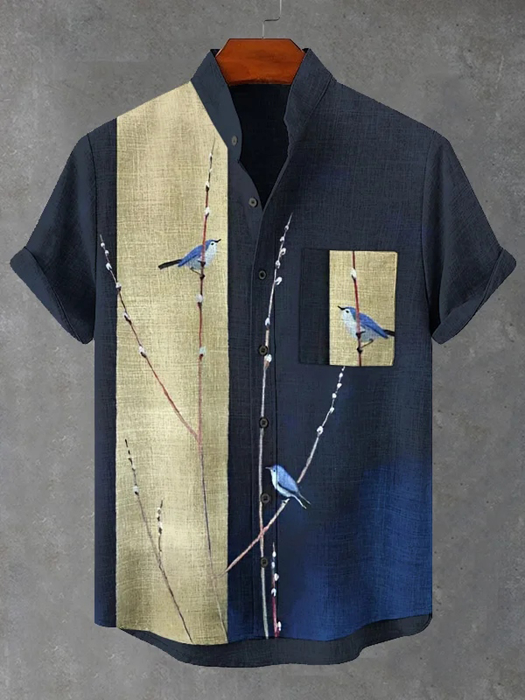 Japanese Geometric Bird & Flower Men's Linen Short Sleeve Shirt